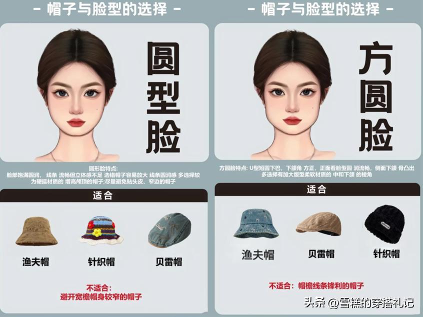 ①圓臉:目標是拉長臉型,增加線條感。應選擇具有明顯線條感和一定高度的帽子,如窄檐的貝雷帽(斜戴)或有立體感的針織便帽。