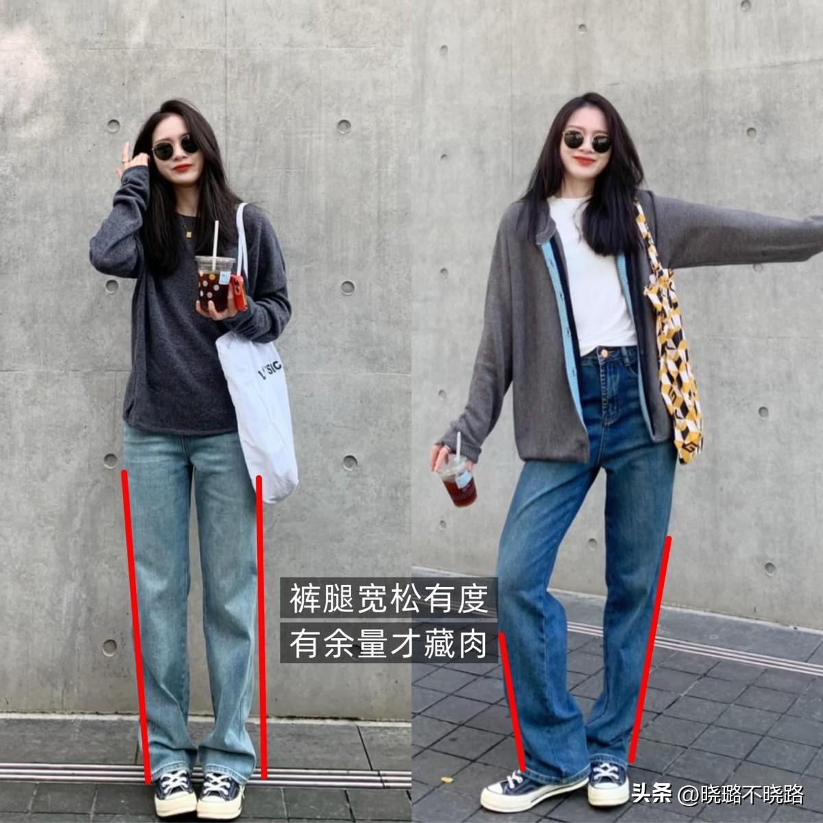 褲腿跟腿型之間,擁有一定的餘量,纔能有效的遮擋住贅肉,裁剪設計利落流暢,儘量以筆直的線條感爲準,視覺上才能削弱臃腫感,穿出顯腿細的效果。