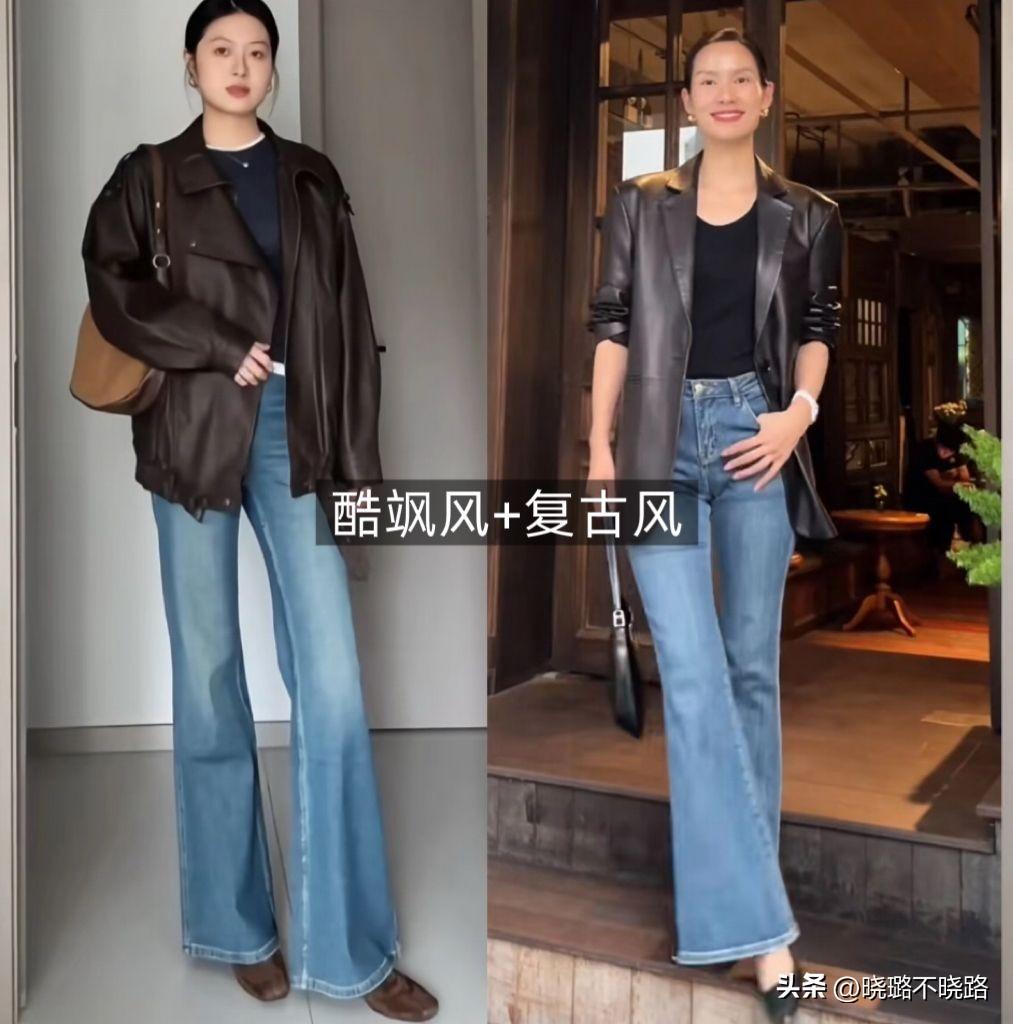 搭配示範:皮夾克+牛仔喇叭褲+低跟鞋