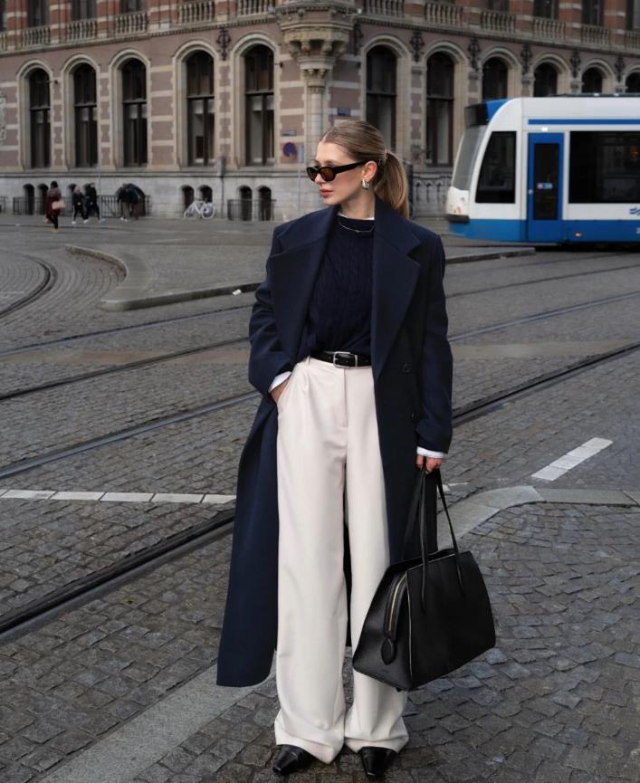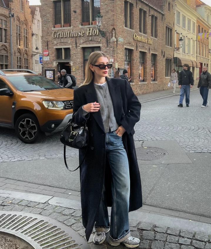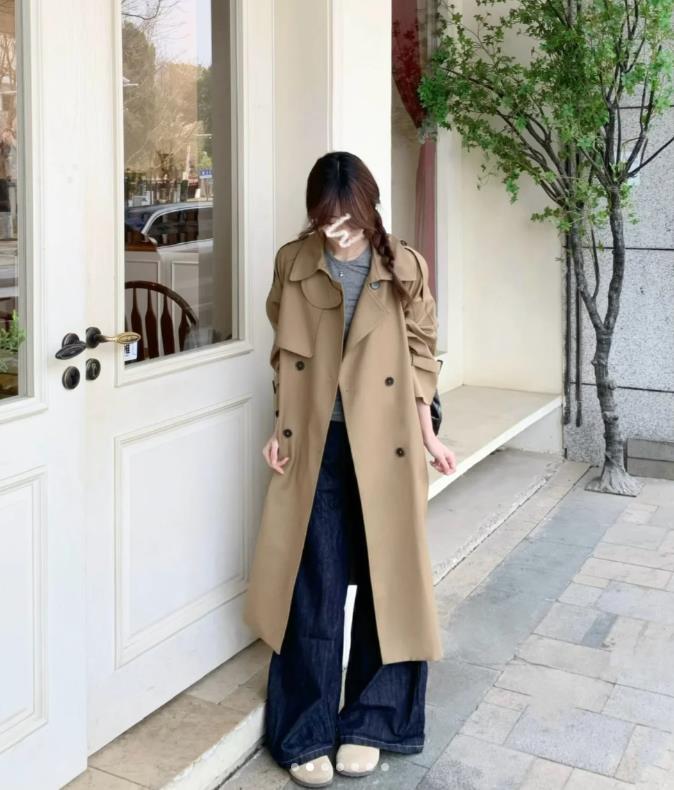 這一套是經典與鬆弛感的結合,卡其色雙排扣風衣,相信在很多女性的衣櫥裏都會有吧?直接敞開來穿,盡顯通勤與率性,內搭灰色上衣,加上深藍色牛仔闊腿褲,隨性又顯高挑。鞋子是一雙淺米色的,讓整個穿搭看起來更和諧了,反正就是一套很有格調的造型。