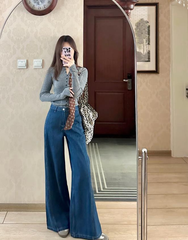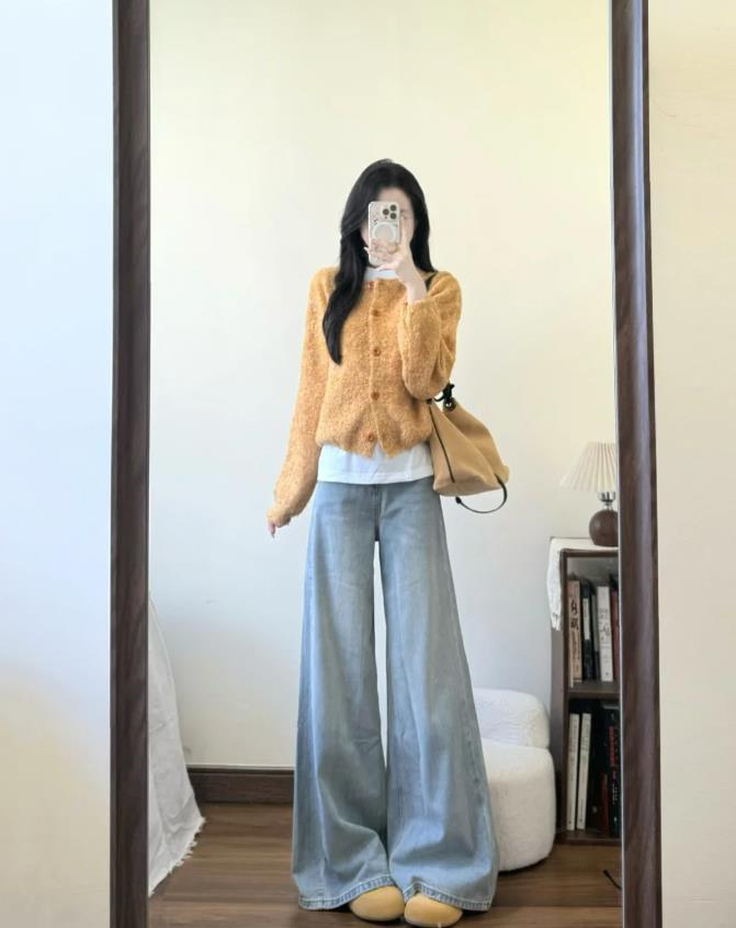 很喜歡這種慵懶感十足的穿搭,日常這麼穿着上班、或者是逛街什麼的,就很輕鬆自在。暖黃色毛衣開衫,裏面疊穿一件白色t恤,增加層次感的同時,又保證了穿着溫度,搭配淺牛仔藍闊腿褲,顯瘦顯高,腳上的淺黃色鞋子,與毛衣進行了呼應,整個穿搭瞧着是非常溫柔鬆弛的。