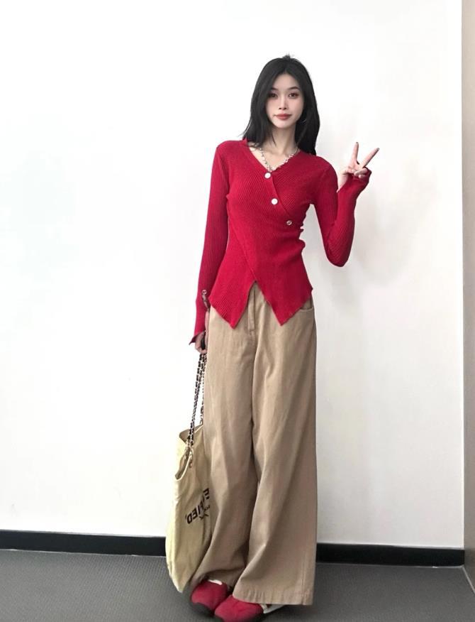 紅色v領針織衫,這款上衣的設計感真的非常不錯呢,輕鬆勾勒出完美的身材比例,還不失精緻感。下身搭配一條卡其色闊腿褲,寬鬆的版型,盡顯隨性,也弱化了上衣帶來的緊身感,紅色運動鞋與上衣呼應,整個色彩很協調,這是一套非常吸睛的日常穿搭。