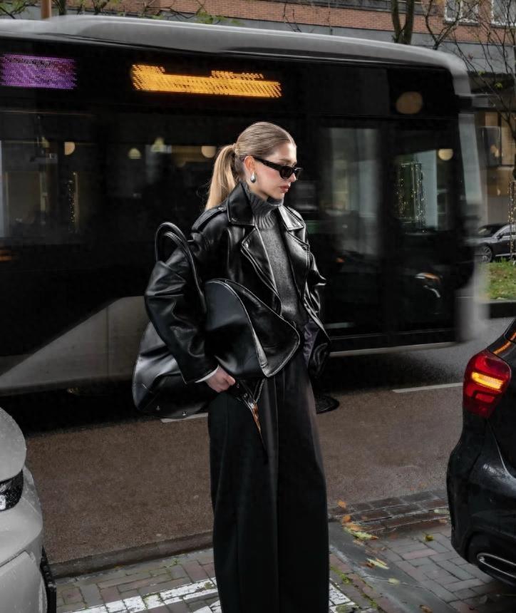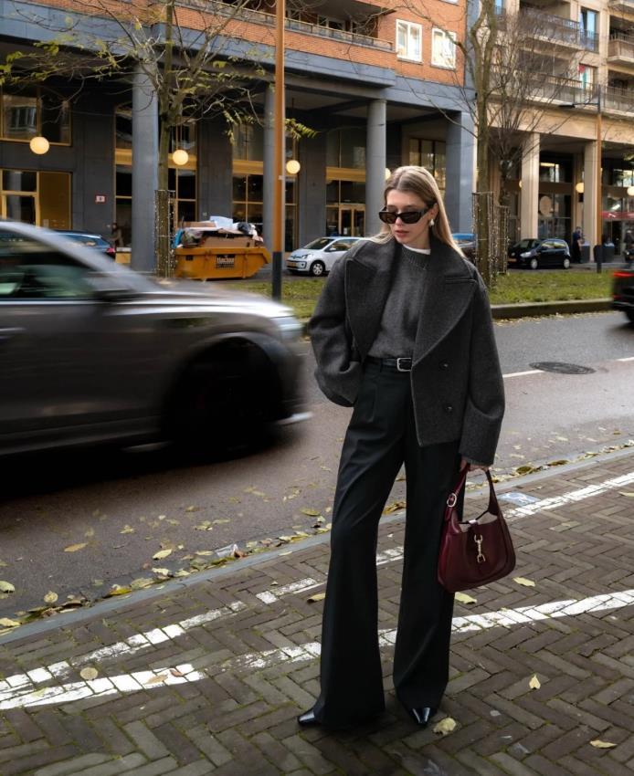 上緊下松的搭配,就是能很好優化整個身材比例,同時在視覺上給人呈現出一種瘦身的效果。灰色針織衫搭配波點領帶,增加了造型細節又不失精緻感。深藍色牛仔闊腿褲,穿起來顯瘦又顯高,豹紋包包復古吸睛,鞋子是德訓鞋,整體將復古與休閒完美融合。就是一種很有格調的搭配。