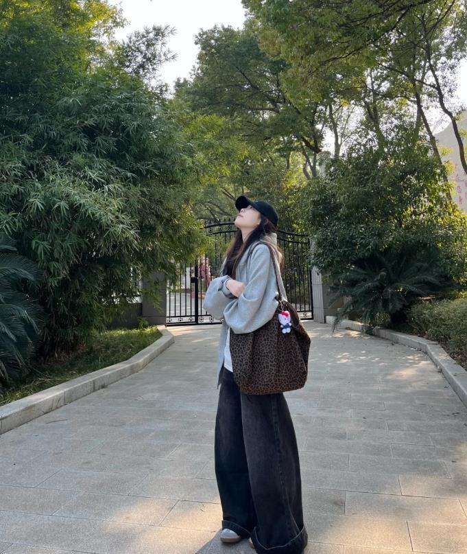 這一套穿搭整個風格是很休閒隨性的,淺灰色連帽衛衣外套,裏面疊穿了白色打底,增加了層次又保暖。與深灰色牛仔闊腿褲相配就更多了幾分鬆弛隨性,腳上一雙德訓鞋,讓整個穿搭看起來更休閒自在,日常出行,或者是上班這麼穿都很不錯。