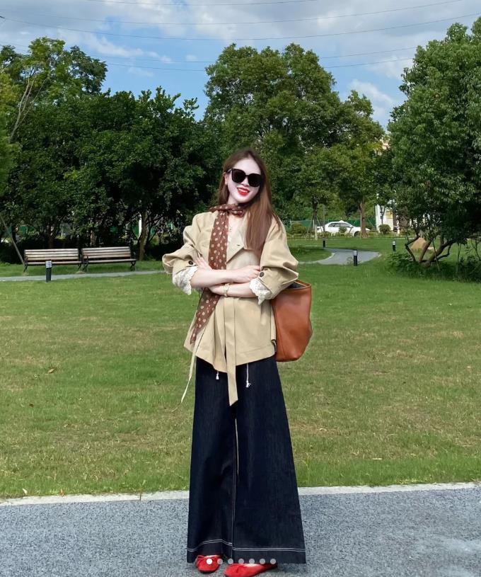 卡其色的短款風衣,穿起來真的很顯利落有型,對於個矮的女生來說,這種長度最合適了。利用波點絲巾進行點綴,也太不失精緻和細節感了,選擇深色闊腿褲來配,輕鬆拉長了整個身材比例,棕色復古包包,以及紅色的鞋子,都點亮了整體,墨鏡加持後就更顯氣場了。