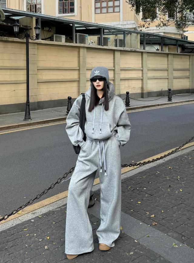 不懂穿搭的姐妹,可以直接選擇闊腿褲套裝,就好像這一套衛衣+闊腿褲的套裝,同色系的組合,很省心也不容易出錯。淺灰色連帽衛衣+同系列闊腿褲,整個穿搭看起來很隨性。搭配灰色帽子、黑色墨鏡,這些配飾的加入,提升了時髦感,又顯得有些酷感。