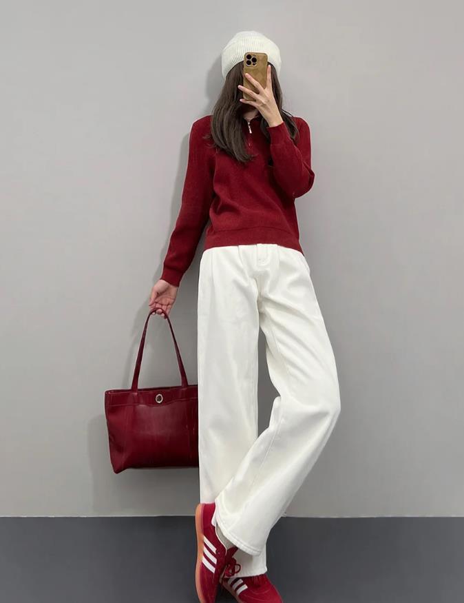 這一套穿搭,主要配色是由酒紅+白色組成的,很適合在秋冬季節裏穿,輕鬆打造出活力與洋氣。酒紅色半拉鍊毛衣,簡單卻很好看,選擇白色闊腿褲,整個穿搭又顯得很隨性,頭上佩戴的白色針織帽增添了溫柔,酒紅色手提包和紅白運動鞋進行了呼應,總得來說就是舒適又時尚的造型。