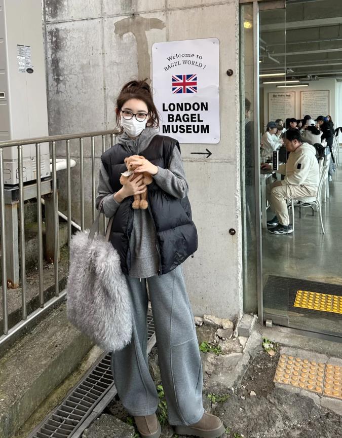黑色羽絨馬甲疊穿灰色連帽衛衣,這樣的搭配休閒隨性又保暖,牛仔闊腿褲的加入,更是爲整個穿搭增添了活力與青春感。腳上踩着一雙棕色厚底靴,保暖效果真的超級棒的。整個色調相對來說很和諧,也兼具了溫度與風度。