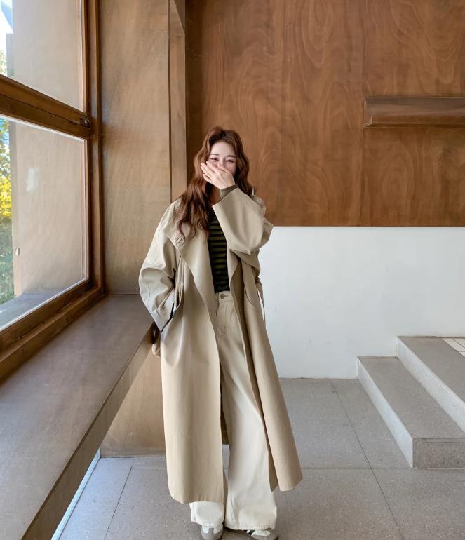 很簡約又不失大氣的一套穿搭,卡其色長款風衣,真的每年秋冬季節都會流行,寬鬆的版型,對身材有着極佳的包容性,也能穿出幹練與氣場,內搭黑綠條紋上衣,豐富了整個穿搭造型,下身是一條淺米色闊腿褲,休閒隨性,整個色調和諧統一,優雅與鬆弛感完美結合。