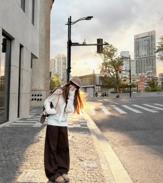 屬於秋日的溫柔與鬆弛在這一套穿搭上很好展現出來了,米白色毛衣開衫,軟軟糯糯的材質,單穿也很舒服。搭配深棕色闊腿褲,垂墜感十足的褲子,顯得隨性又顯腿長,鞋子和挎包顏色相呼應,讓整個色調看起來很和諧,盡顯慵懶與精緻的打扮。