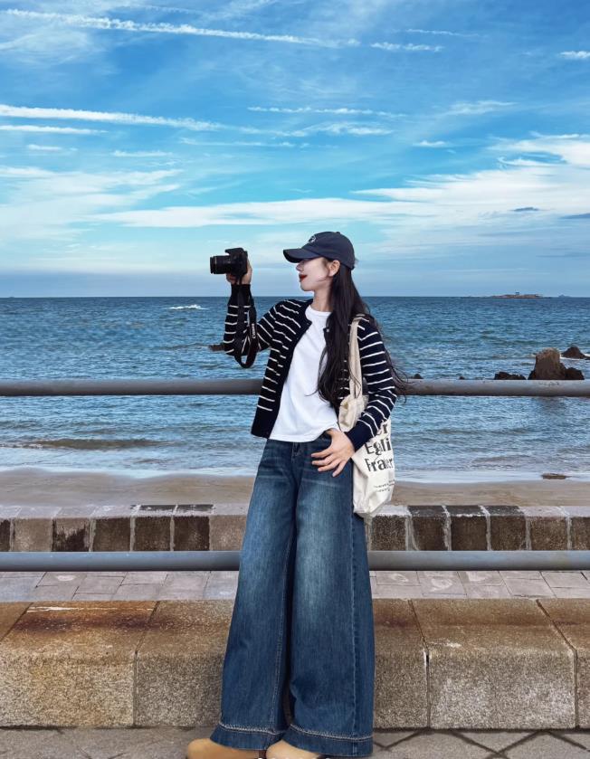 休閒隨性的打扮,喜歡這種風格的就可以借鑑起來,黑白條紋開衫,裏面疊穿了一件白色t恤,顯得很休閒自在。深藍色牛仔闊腿褲,寬鬆的褲型,對所有問題腿型都有着非常好的包容作用,腳上棕黃色鞋子恰到好處點亮了整個造型,舒適時尚。