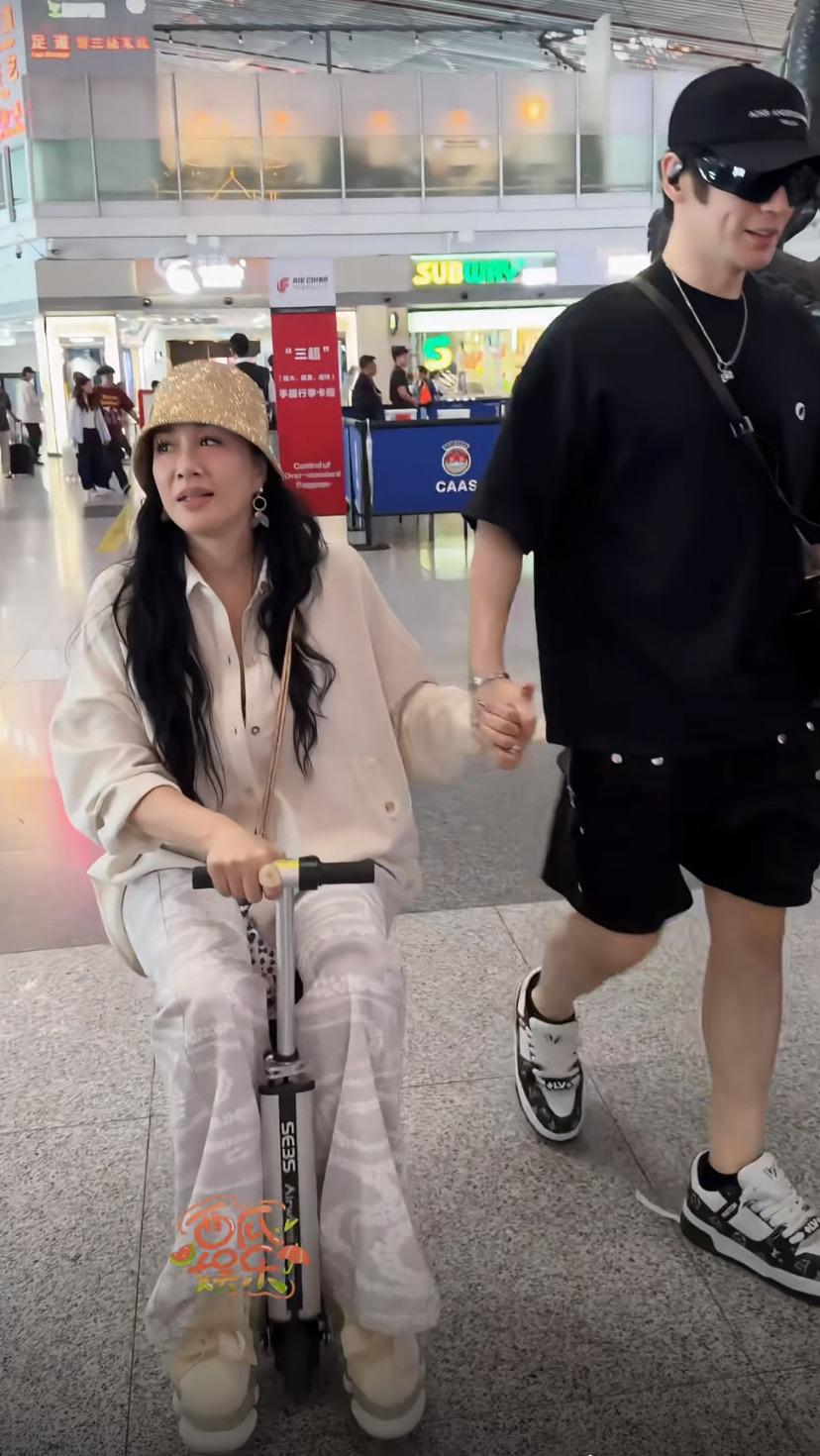 別看這倆也是老夫老妻了,現身機場永遠都是手牽手的幸福模樣。鍾麗緹騎在電動行李箱上,張倫碩拉着她的手滿臉笑意,張倫碩就是他的方向盤!
