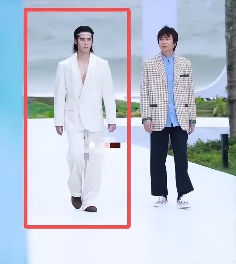 尤其是在整體造型上,寬鬆的白色西服套裝,愣是把一米八二的大高個,切成了身材五五分,像是隻有一米五的小個子。