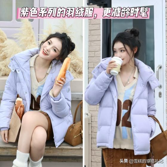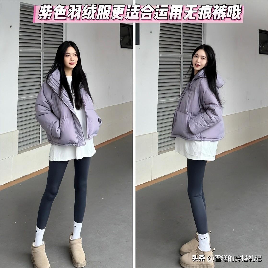紫色系列的羽絨服是非常極具百搭性的,不管是與什麼樣的下半身單品都可以很好的組合出來,更爲時髦好看的視覺效果。但是在當下的階段當中,爲了保暖和能夠體現出來好看時髦的氣質狀態爲主,推薦大家可以首選帶絨帶棉的無痕褲以及進行搭配,真的非常的減齡、好看又保暖。