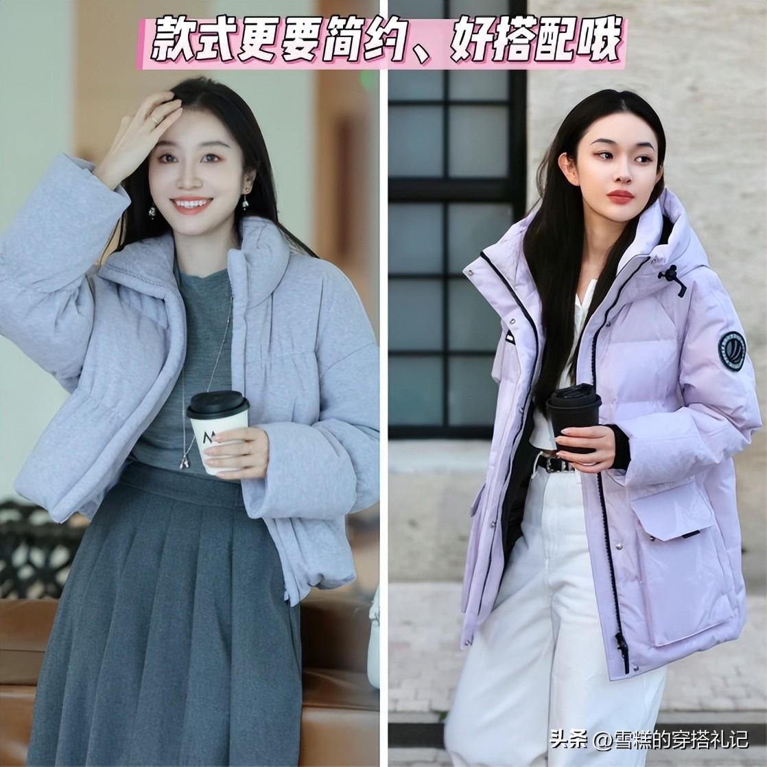 第二種羽絨服的色調推薦,大家可以在秋冬季節的時候將很受寵、很時髦的紫色料來進行運用,在彩色調的搭配當中,其實紫色不管是飽和度高或者低,對於我們肌膚狀態的顯白效果都是很好的,而且紫色系他本身所襯托出來的減齡感和時髦感真的很明顯,有不少女藝人們在今年都在選擇進行搭配呢。