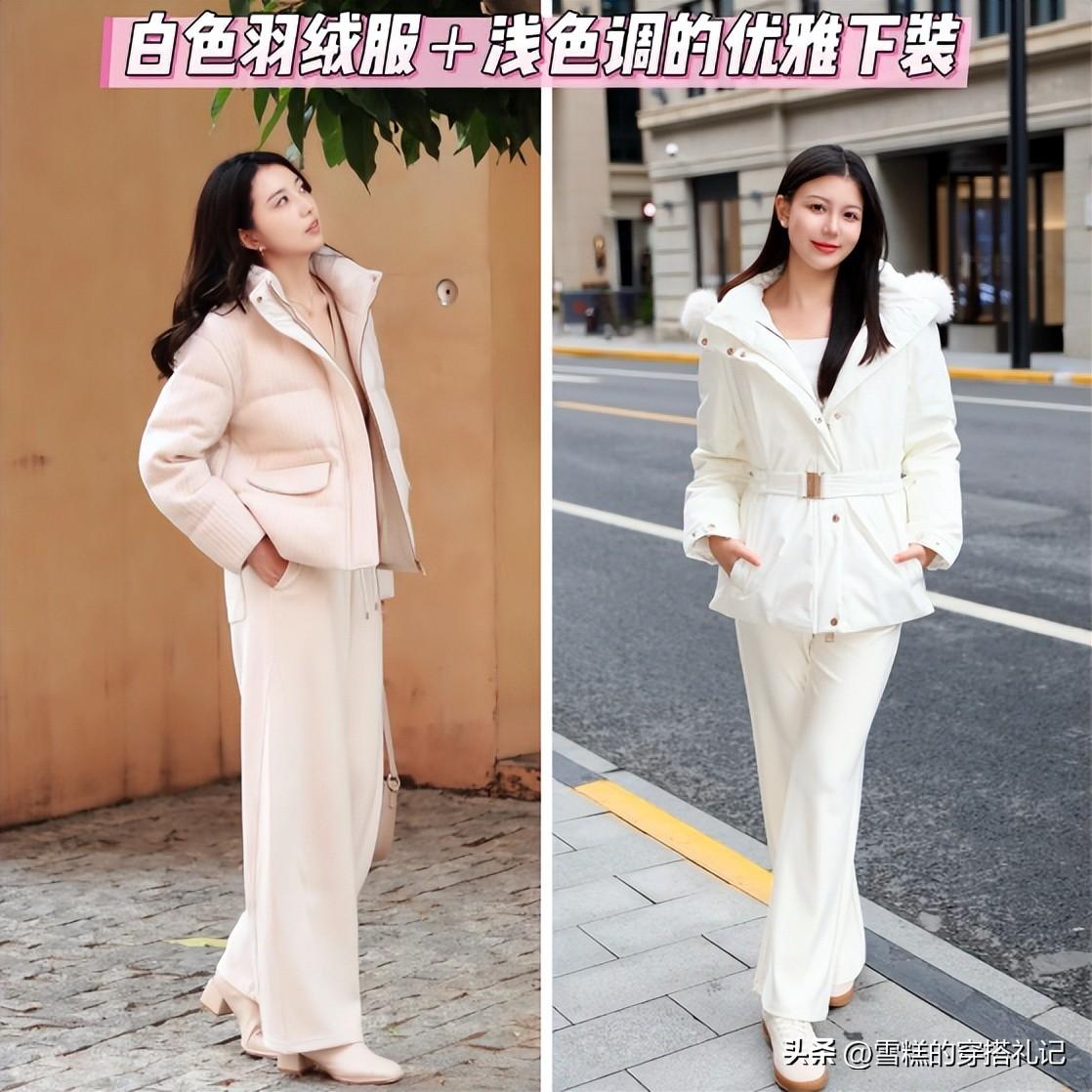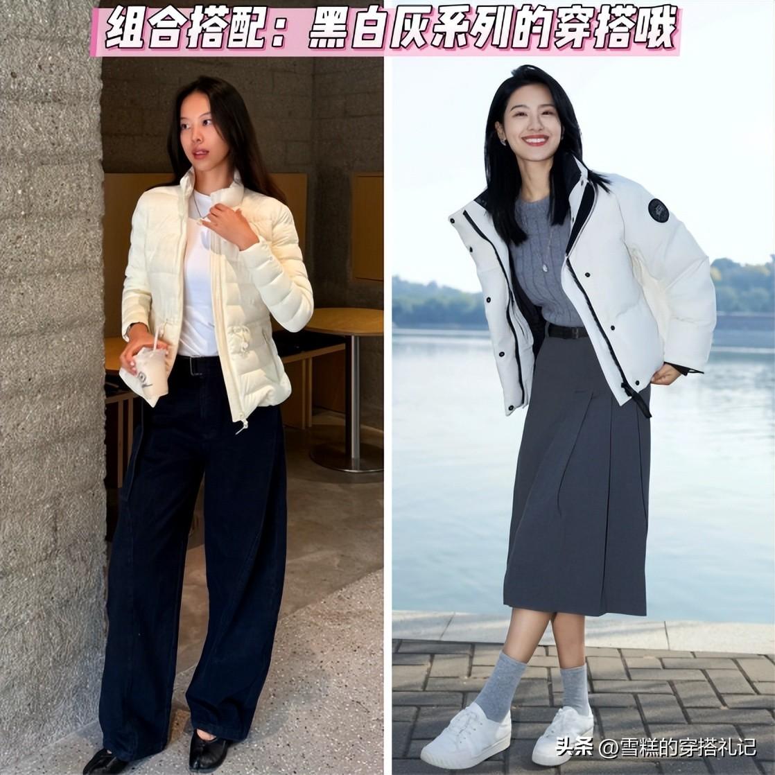當然了,白色系列的羽絨服在進行搭配的時候,相信對於不少的女性來說是想要襯托出來更加凸顯優雅和溫柔感的氣質狀態的,那麼大家下半身的系列完全可以搭配淺色系列的豆腐褲,或者是垂感較重的一些闊腿褲以及簡約又優雅的裙子,與其進行組合呈現的溫柔大氣的感覺真的非常明顯。