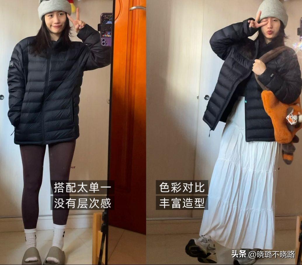基礎款式的排骨羽絨服敞開穿之後,內搭修身打底衫,下身配條高腰長裙,再踩雙厚底運動鞋,活力值蹭蹭往上漲,配色“深淺分明”更出彩。