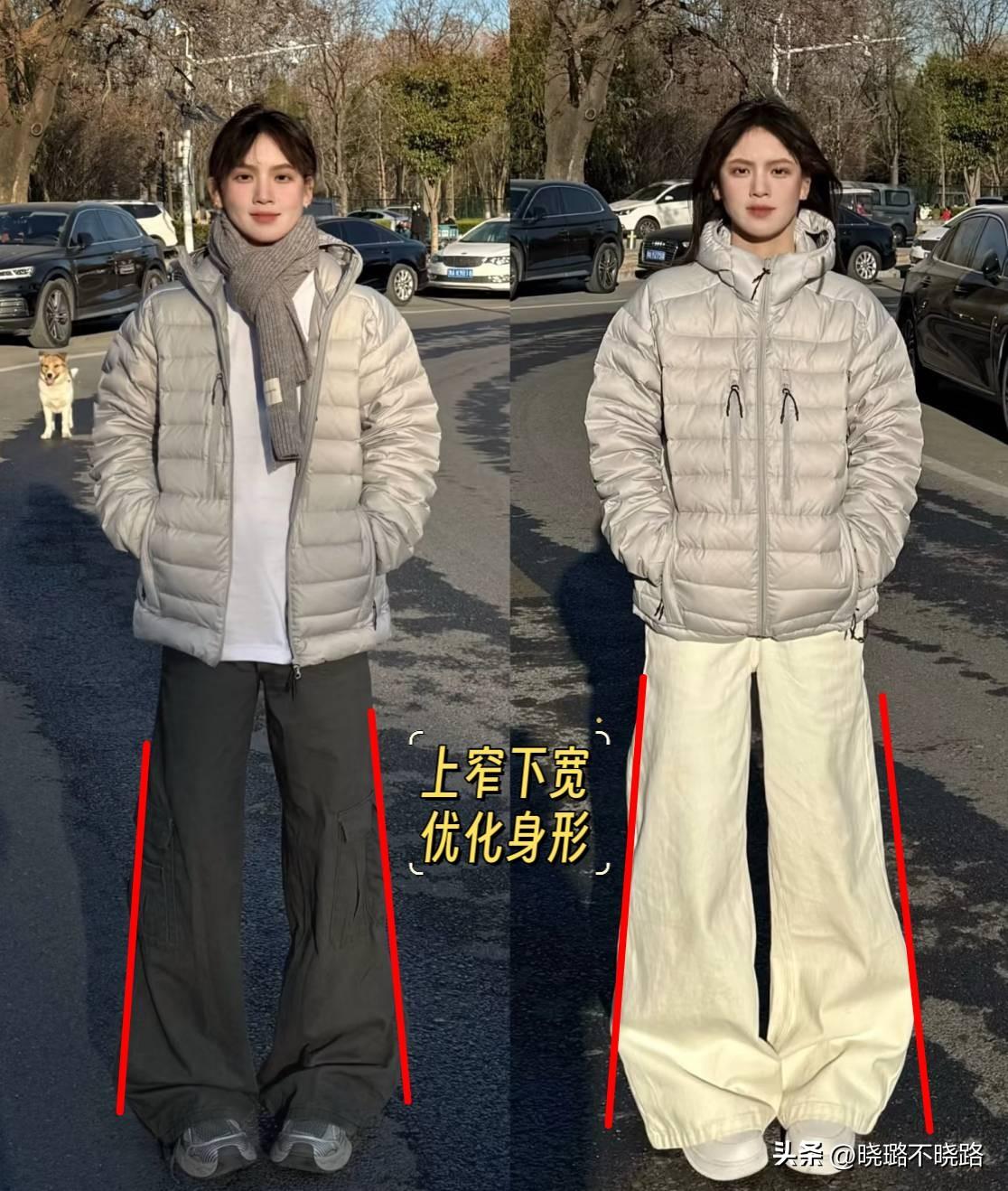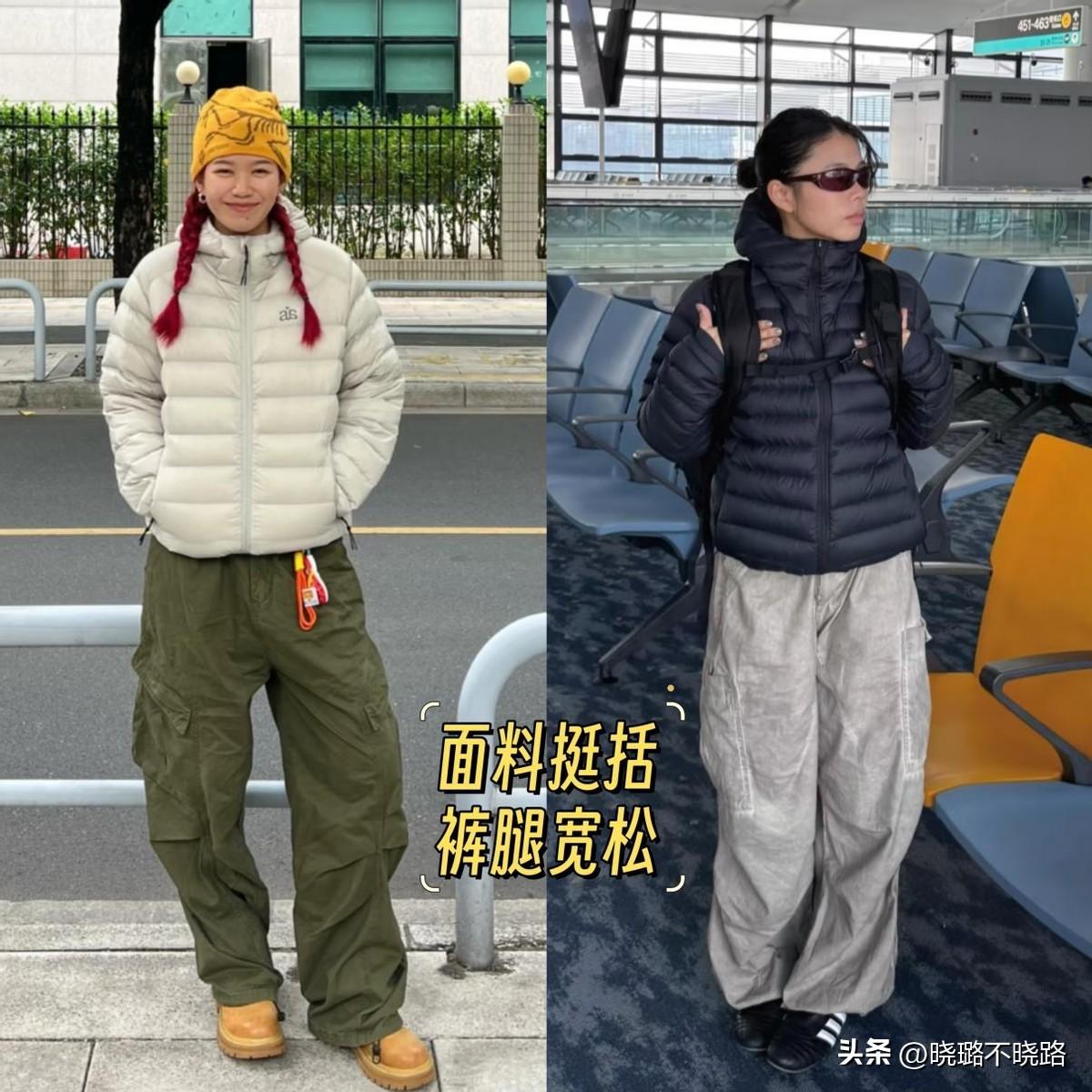 穿排骨羽絨服,只要選對“下裝”就能成功一大半,像這種“由上而下”逐漸變寬的降落傘褲,就能和羽絨服相互平衡,褲腿遮住鞋面位置,配條厚底鞋更顯腿長。