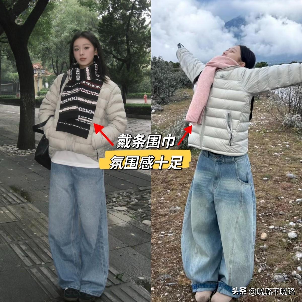 寬鬆版型的牛仔彎刀褲,在今年非常受歡迎,和短款的排骨羽絨服相得益彰,再繫條圍巾,氛圍感拉滿,外擴的褲型,藏肉又有型,盡顯隨性韓範兒。