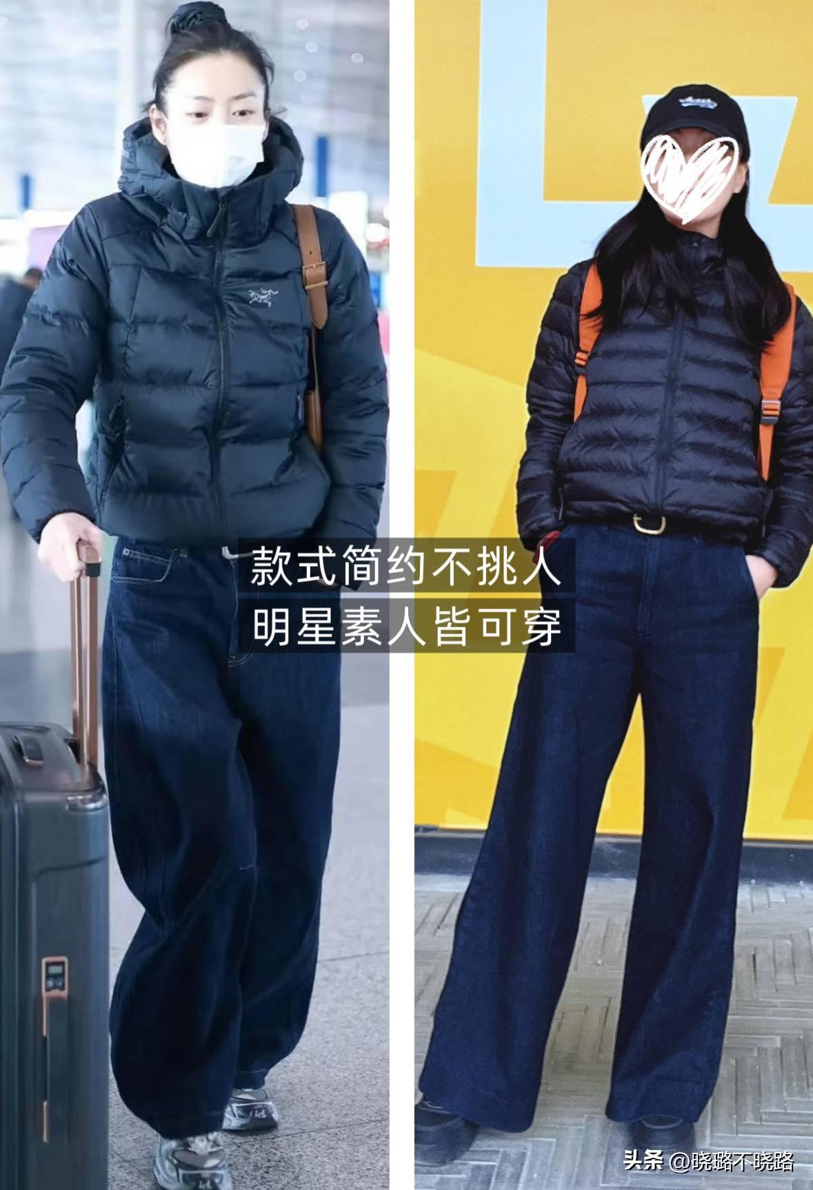 排骨羽絨服和牛仔褲,可以說是“老搭檔”了,但是千萬不要穿牛仔小腳褲、法棍褲、煙管褲,褲腿越窄,造型越老土,褲腿越寬,穿搭越時髦。