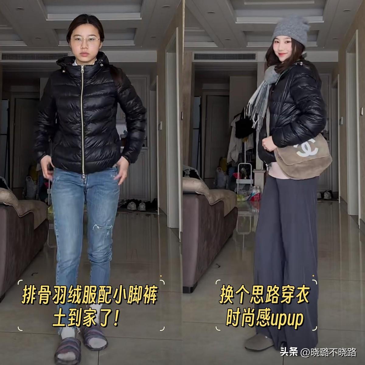 衣服穿的不好看,有時候不是你的問題,而是穿搭思路的問題。同樣是黑色的排骨羽絨服,配緊身款式的牛仔小腳褲,給人的感覺就非常老土俗氣。
