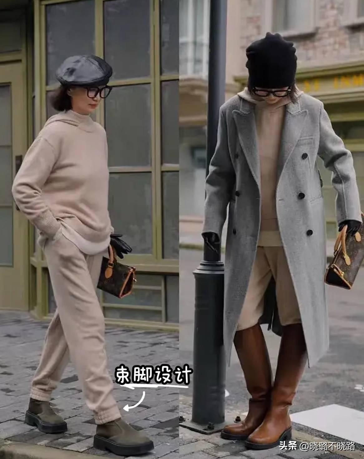 像三木媽媽身上這套休閒套裝,誰穿誰顯年輕,連帽衛衣+束腳衛褲,再踩雙厚底靴,裹上長款大衣,外套敞開穿,瀟灑又鬆弛。
