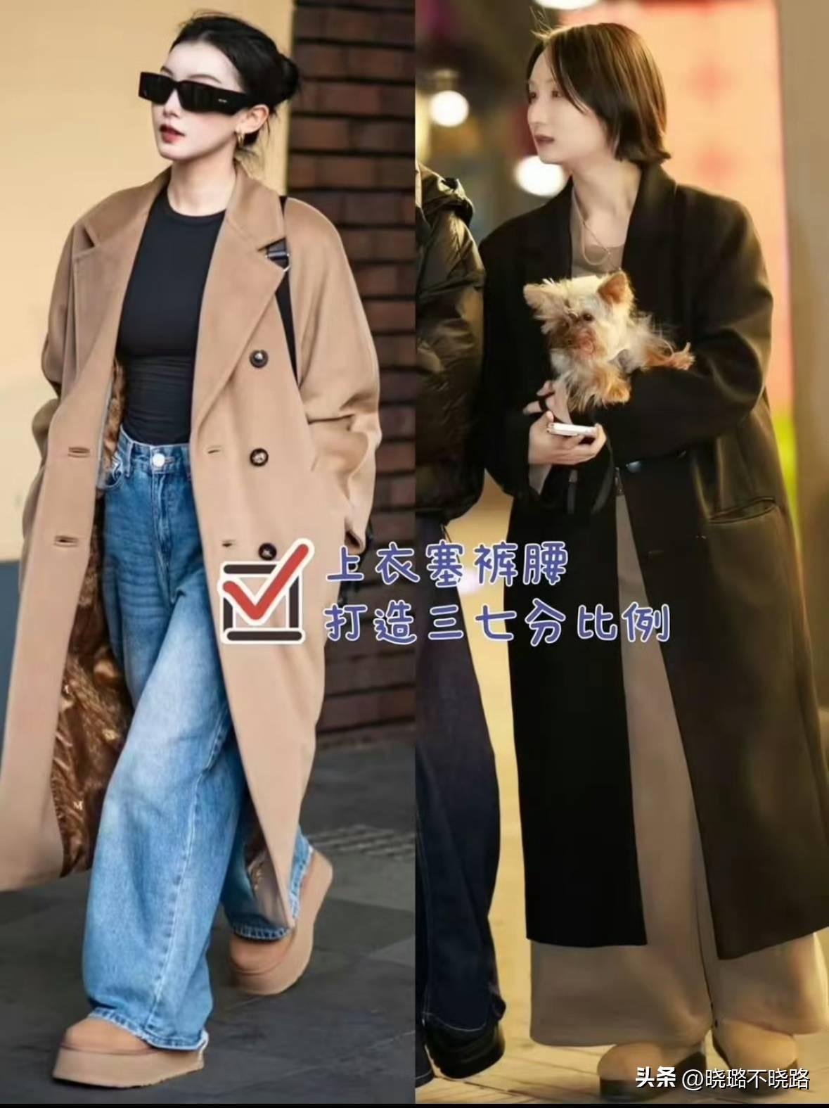 秋冬季節盛行長款單品,例如長風衣、長大衣、長針織衫,當長款外套搭配闊腿褲的時候,就需要將外套敞開穿,內搭的上衣塞進褲腰,打造三七分比例。