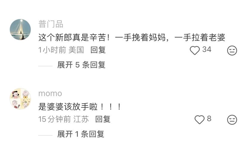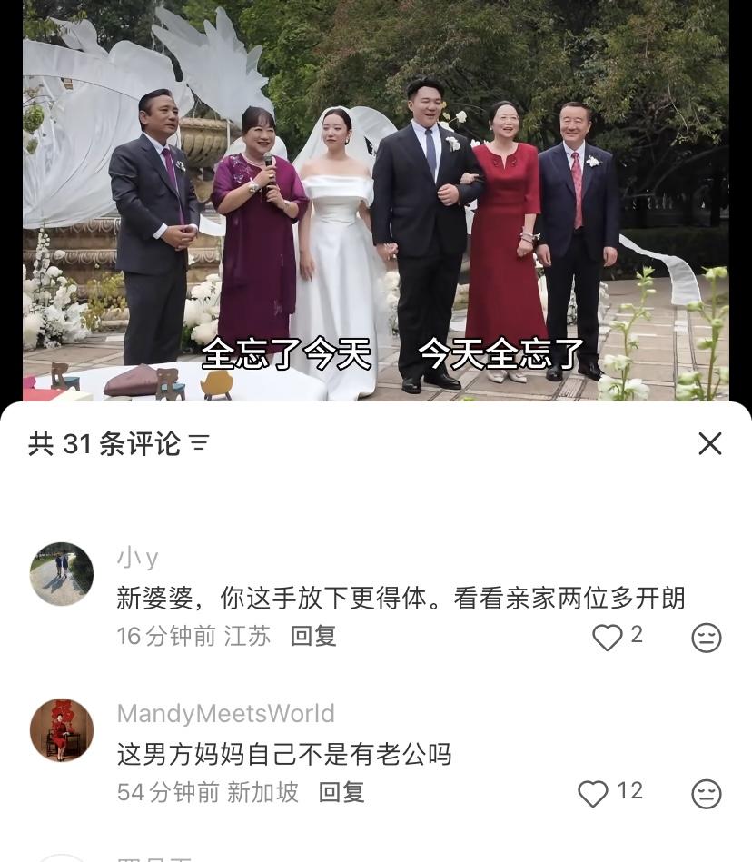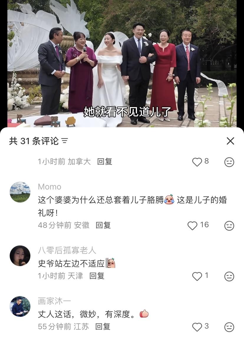 還有網友說,要學學另外兩位親家,多麼開朗。喜婆婆挽着兒子的胳膊,一直都沒有放下,卻是有點太違和了。她本可以挽着自己的老公,從此兒子就是別人的丈夫了,應該適當保持距離。