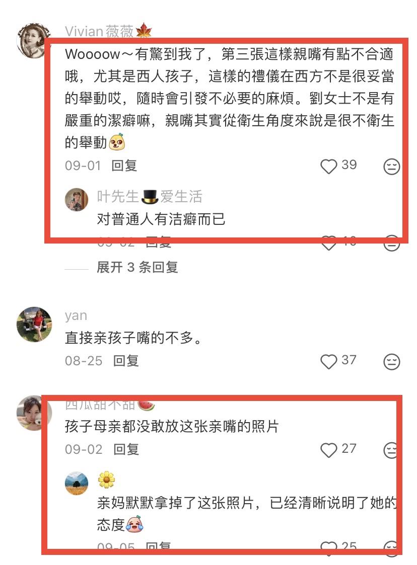 不少網友評論劉嘉玲親吻孩子嘴巴的事情,說這樣的禮儀在西方不是很妥當。其實也沒有什麼不妥當,只要孩子覺得沒關係、不反感就可以啦。