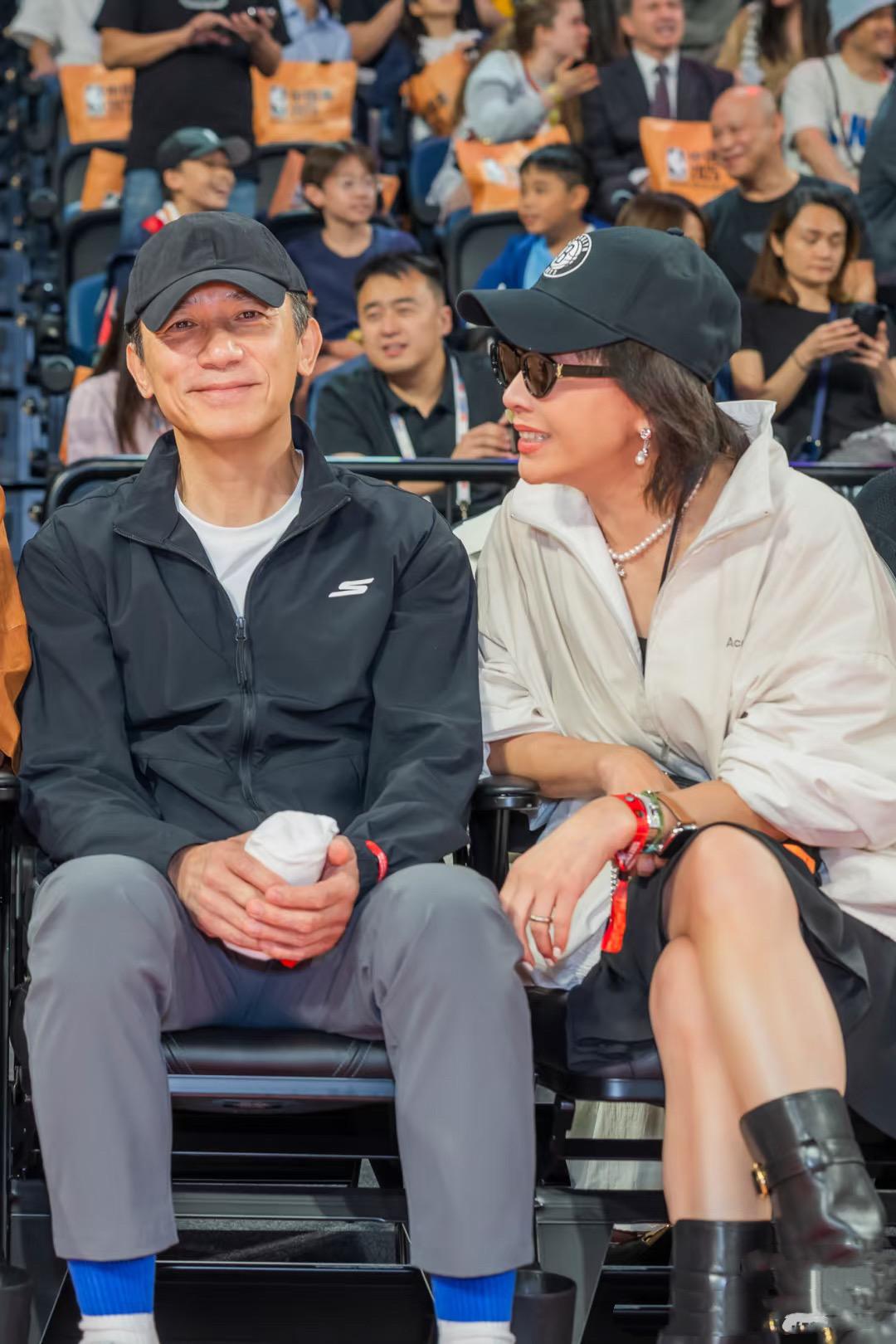 私下裏和梁朝偉一起看比賽,她就打扮的更加休閒減齡。運動風上衣、黑色短靴、棒球帽,帥氣又時尚。梁朝偉有點內秀,她的性格比較大方,倆人很互補。