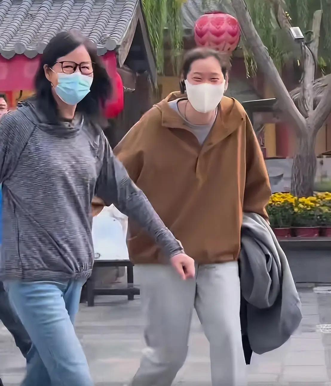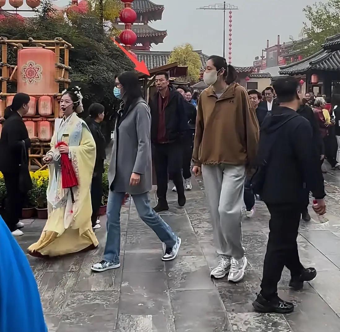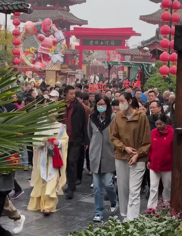 跟在郎平和朱婷身邊的,除了穿着漢服的導遊、保安人員、還有幾位便衣保鏢。郎平已經65歲了,她留着長髮,戴着口罩、穿寬鬆衛衣、牛仔褲看着很減齡。