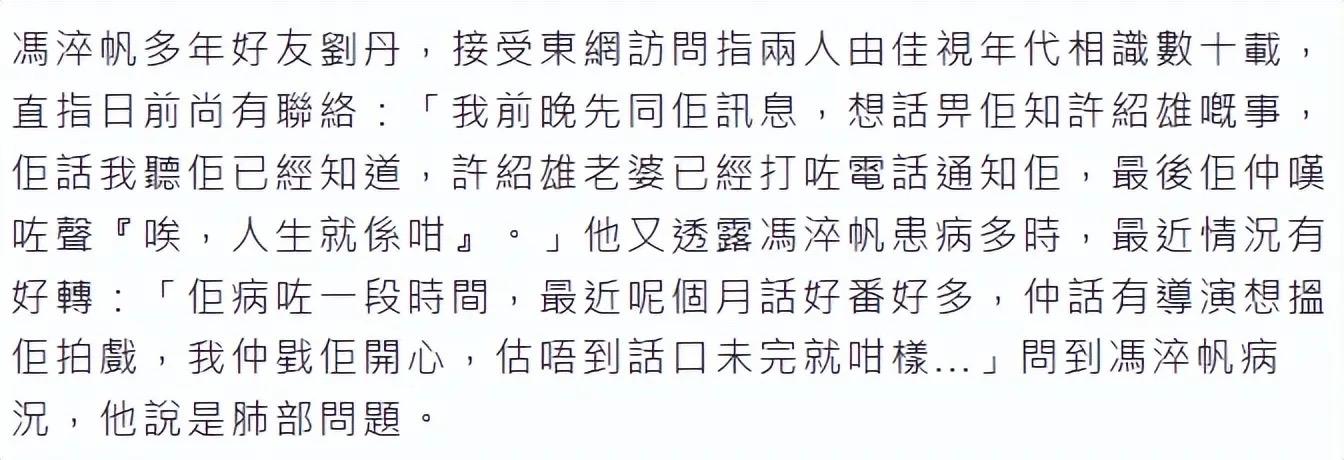 聽到馮淬帆去世的消息,香港藝人也紛紛悼念。劉愷威的父親劉丹表示,前天晚上還和馮淬帆聯繫過。他們還談論過許紹雄的事,感嘆人生無常。