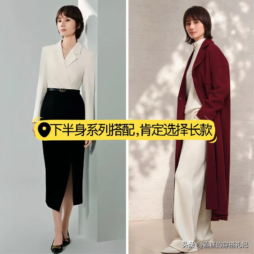 而且像這樣的組合搭配,尤其是對於上了年紀的女性來說,想要展現出來一個非常好看的氣質走向,那麼非常有必要體現我們比例的美感和標準性哦,像大衣以及連衣裙這樣的連體型單品就能夠在高腰的位置進行強調,如果是上下系列的穿搭,那麼就記得運用塞入褲腰或者裙腰的搭配方式呢。