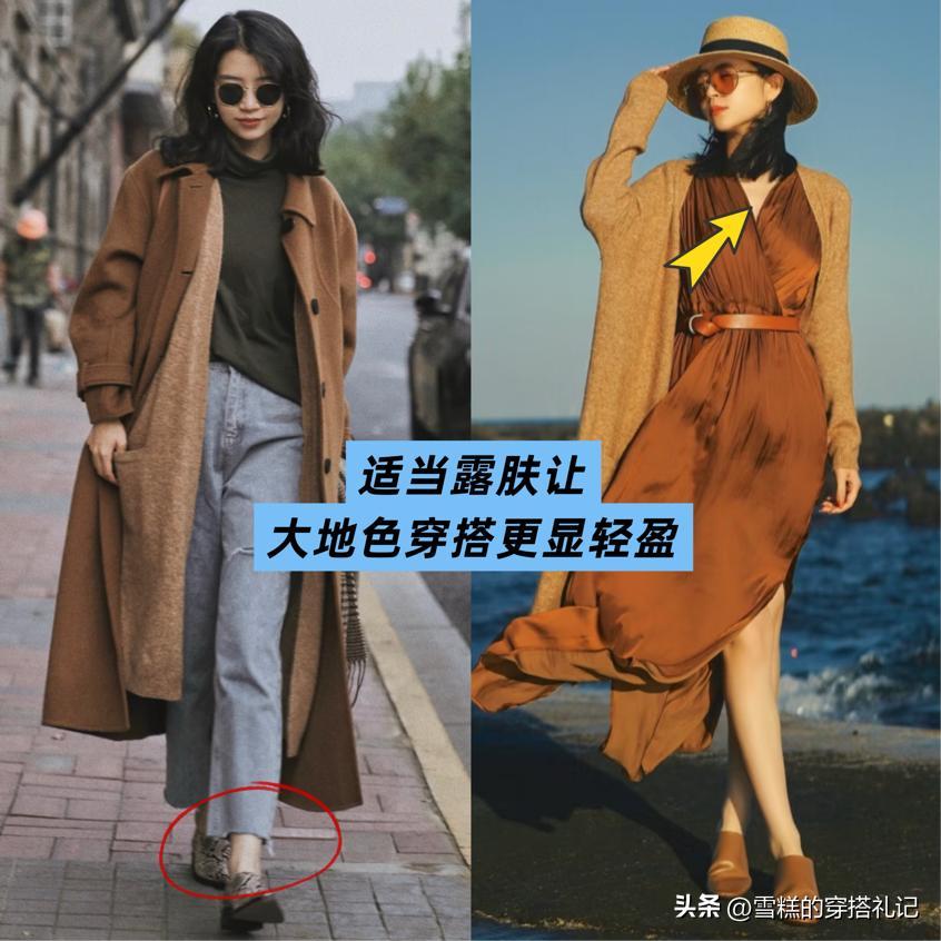 大地色尤其是深色調,在秋冬穿搭中容易顯得厚重壓抑,進而產生老氣感。三木博主擅長通過“小面積露膚”打破這種沉悶,讓造型更顯輕盈靈動,同時保留大地色的沉穩氣質。
