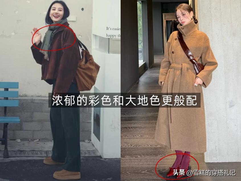 這種搭配的關鍵在於“控制面積”,撞色元素佔比不宜超過10%,且色彩需與大地色形成和諧呼應。三木博主的撞色搭配從不追求誇張,而是通過細節點綴讓造型更有格調,這也是大地色高級感的核心所在。