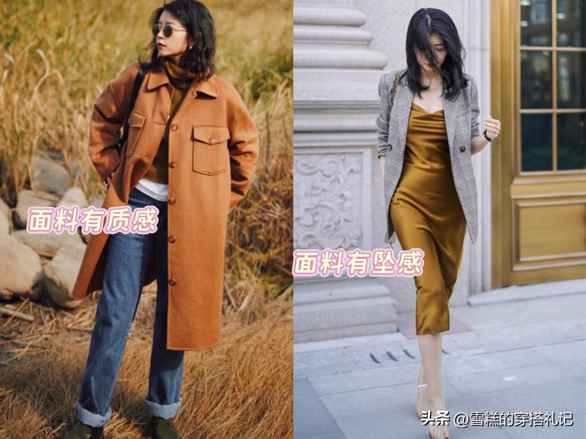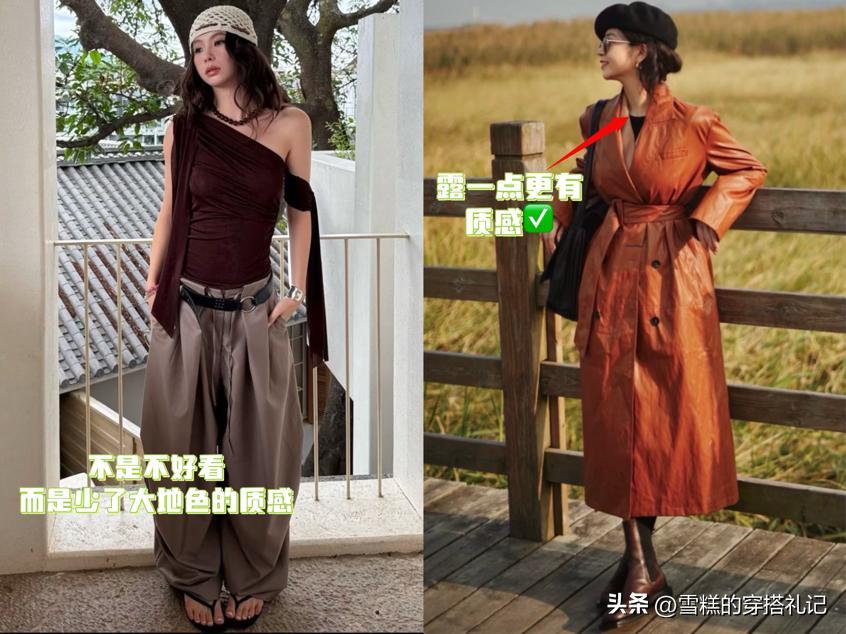 她從不選擇化纖、薄紗等廉價面料的大地色單品,這類面料容易起皺、透光,會讓大地色顯得廉價土氣。選對面料是大地色穿搭的第一步,也是最關鍵的一步,正如三木博主所說:“好的面料能讓基礎款煥發高級感。”
