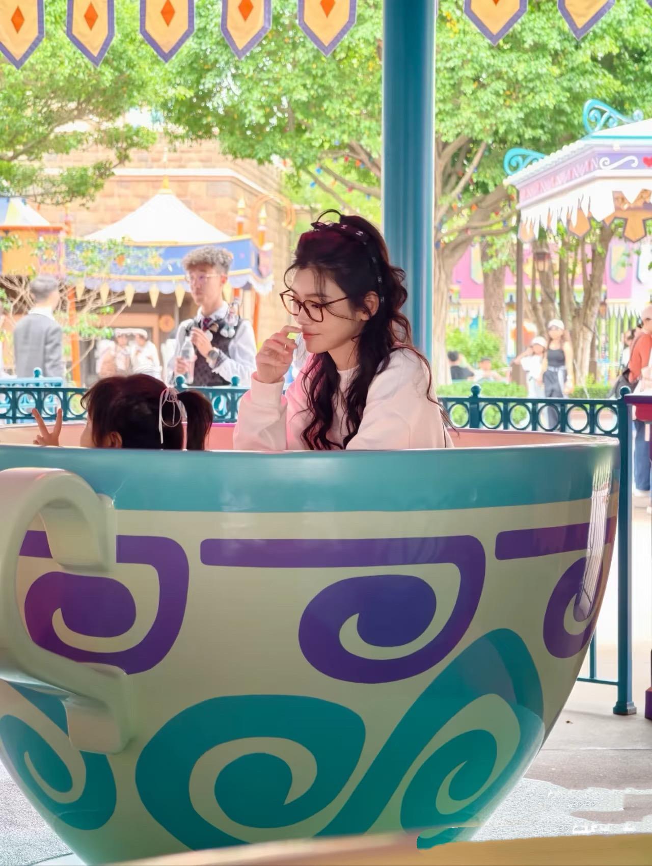 11月2日,是奚夢瑤和何猷君4歲女兒的生日,他們一家人約着朋友到迪士尼玩耍。奚夢瑤打扮的很青春,很甜美。