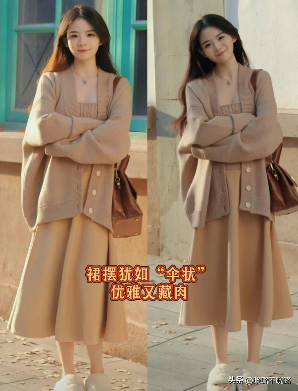 長裙纔是“秋冬保暖神器”,長度“過膝不過踝”,輕鬆隱藏下身短板,可挑選的款式也很豐富,長一點垂感更好,視覺上能夠縱向拉長身形,時髦度100%。