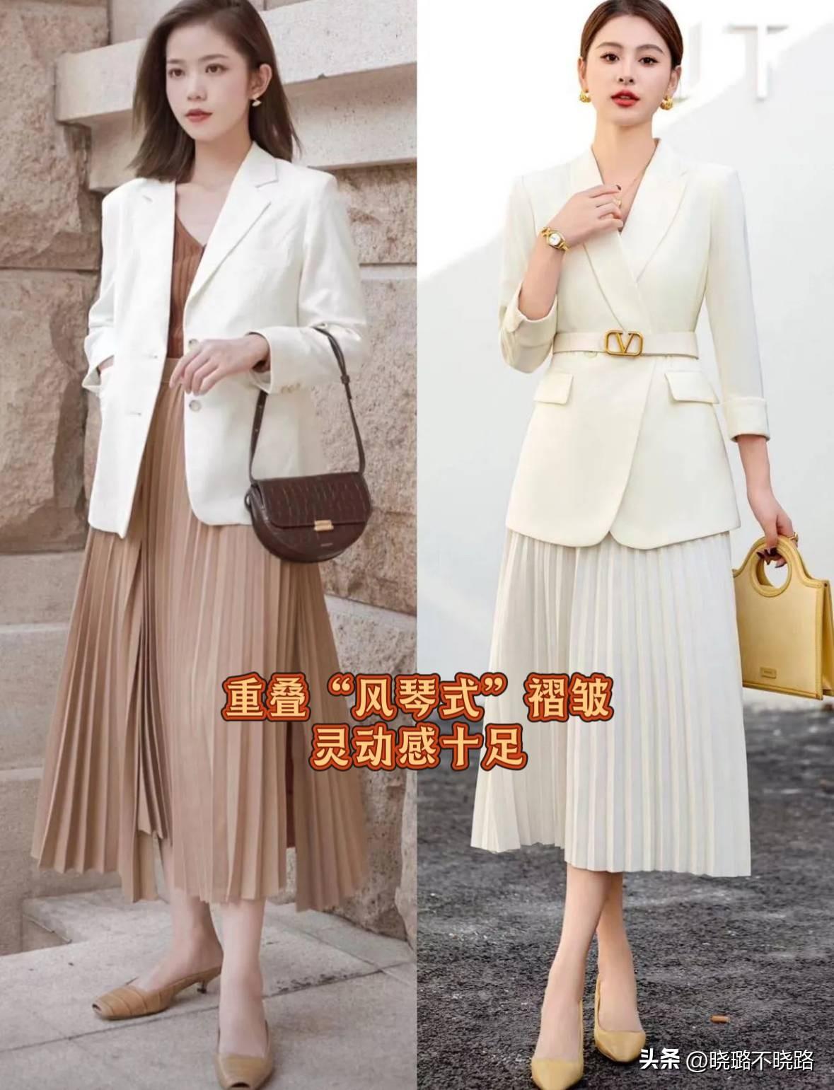 風琴百褶裙和西裝堪稱絕配,這組穿搭不挑剔身材,充滿着高智感,西裝可以敞開穿,或者系根腰帶,配雙低跟尖頭鞋,大女人範兒十足。