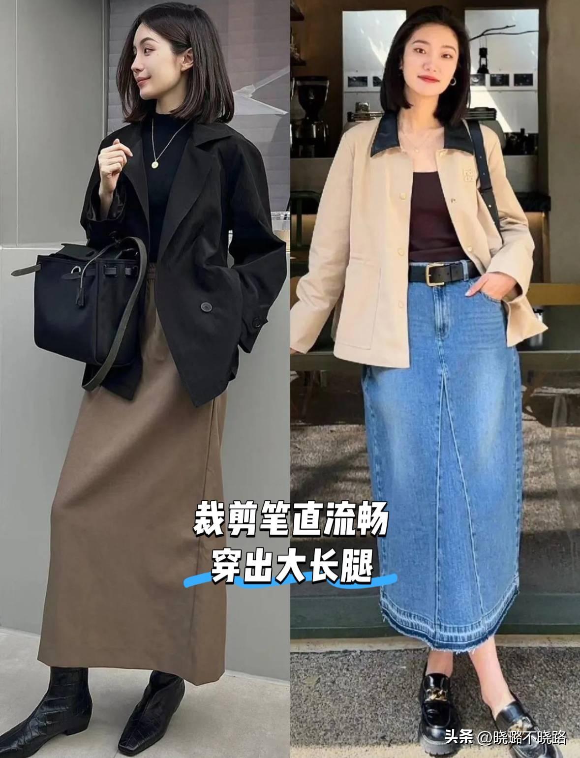 及腳踝長度的直筒裙,直接覆蓋了下半身,所以要搭配短款夾克外套,才能更好的分割身材比例,穿出幹練利落的效果,外套敞開穿,瀟灑又顯高。