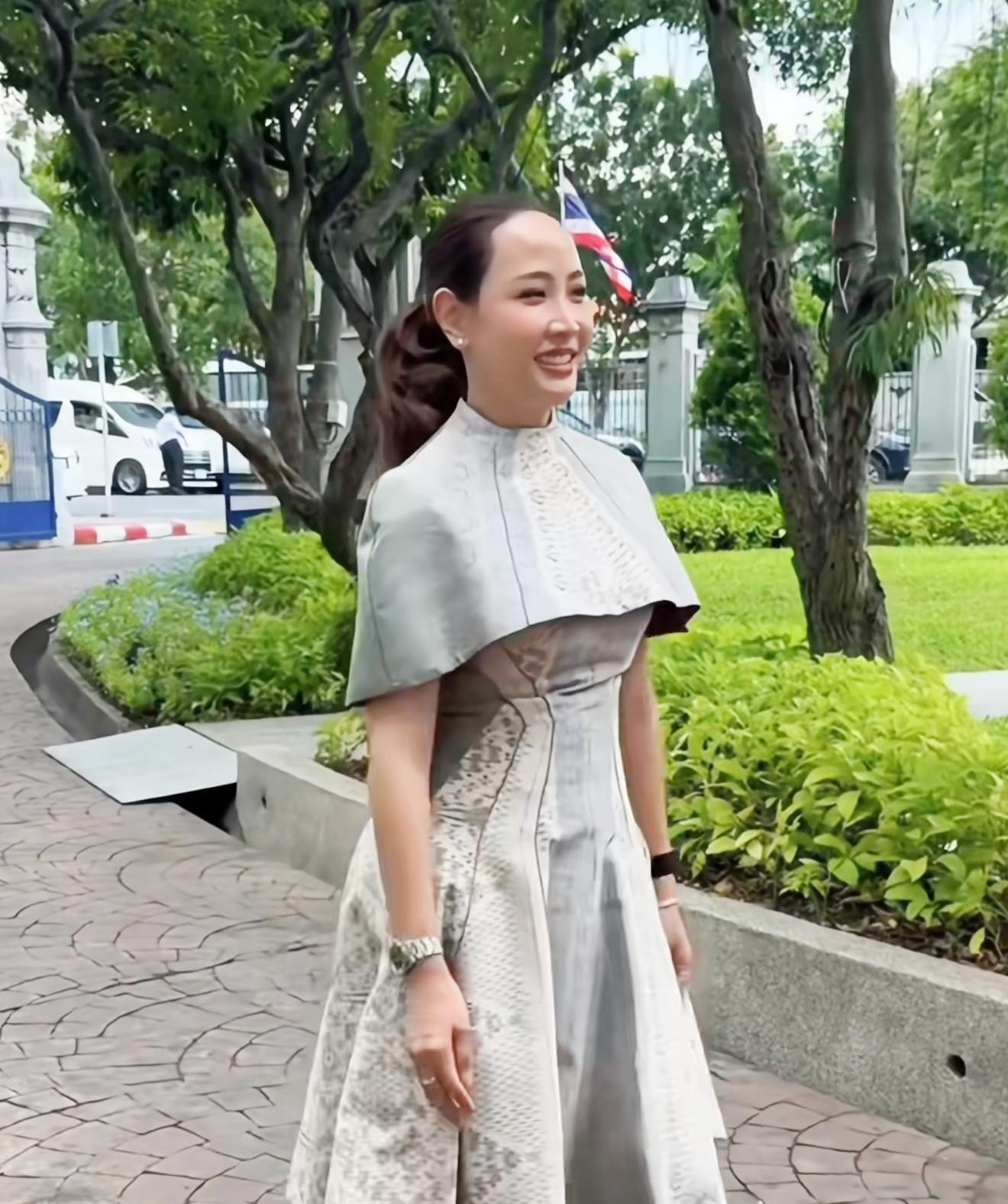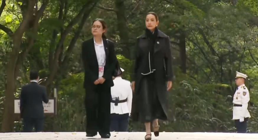 她別出心裁地搭配同色系羊絨圍巾,圍巾末端繡着細小的泰式花紋,既抵禦微涼天氣,又爲硬朗造型注入溫潤質感。內搭黑色高領針織衫與直筒褲,整體線條利落如刀刻,被當地媒體稱爲 “穿黑的女人”,低調卻難掩鋒芒。這種穿搭暗合政治場合的 “安全牌” 邏輯,卻在細節中彰顯個性。
