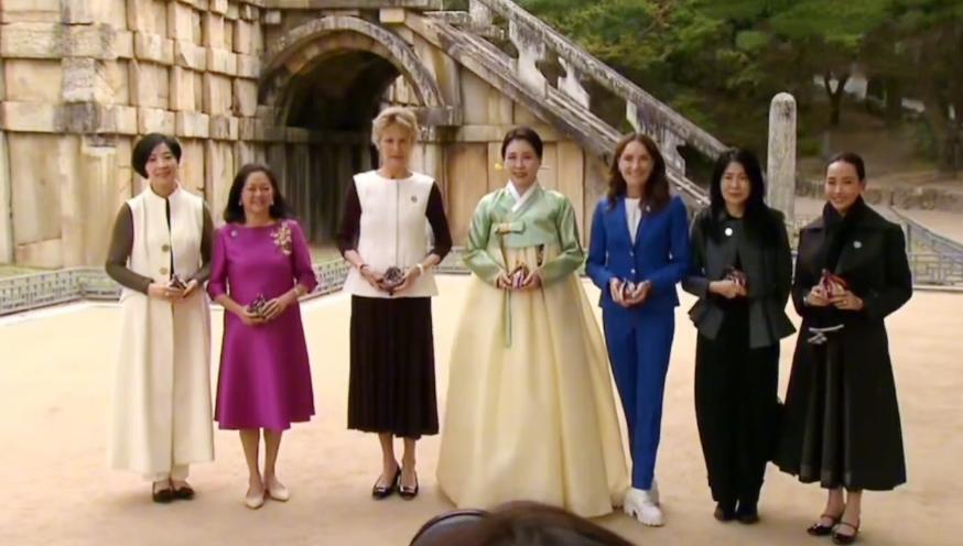 面料選用透氣的棉麻混紡,在秋日陽光下泛着柔和光澤,搭配裸色高跟鞋與極簡首飾,盡顯優雅氣質。即使站在身着韓服的韓國第一夫人身旁,這份 “簡約即高級” 的穿搭哲學,仍讓她成爲鏡頭焦點。正如時尚評論家所言:“她讓黑色從無聊變得有戲”。