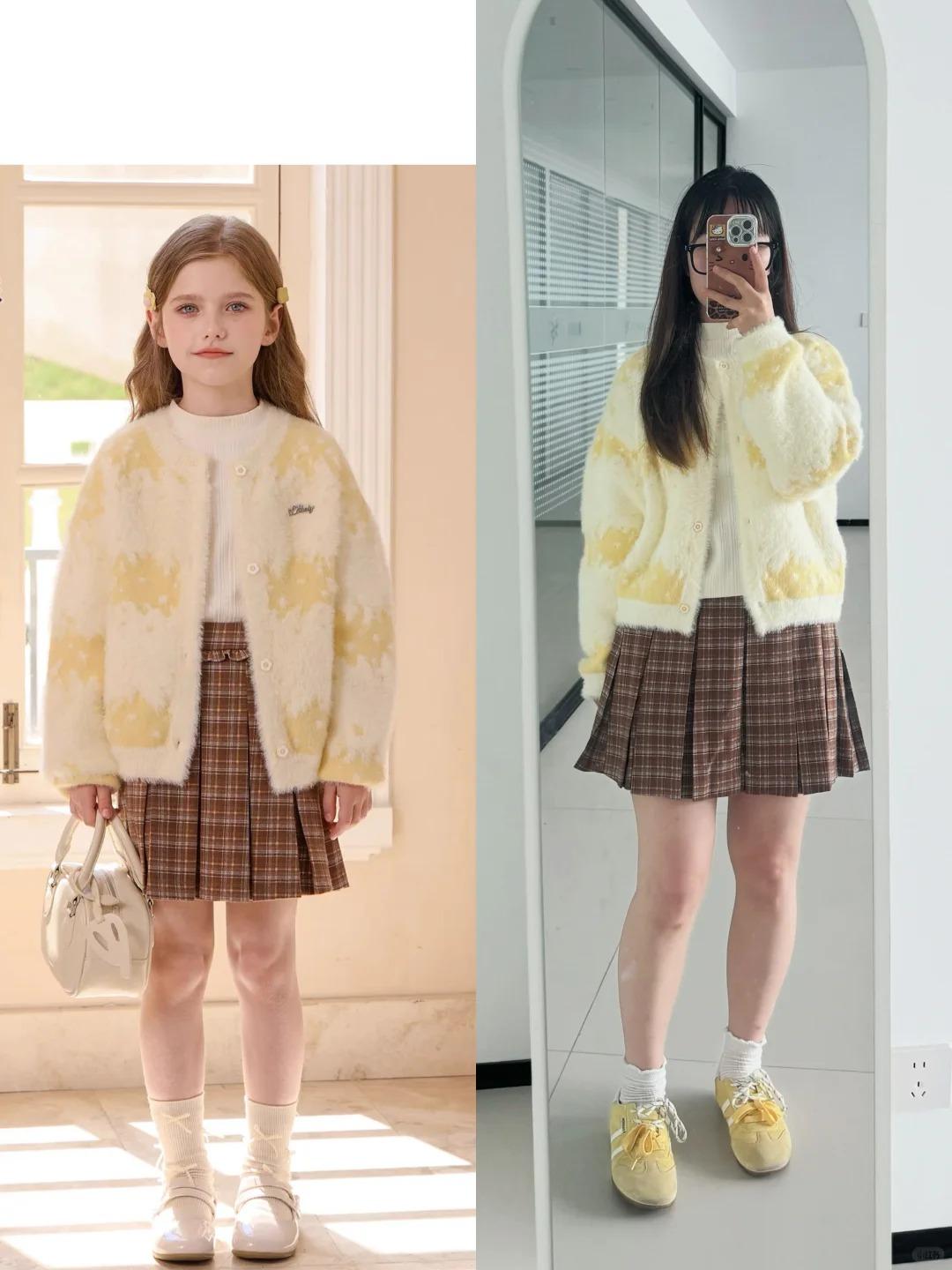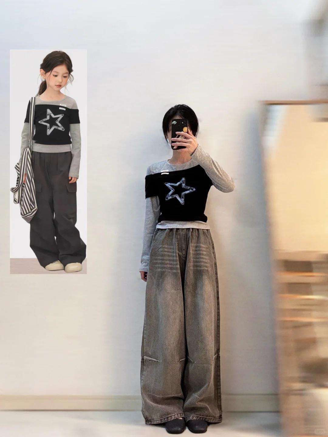 5、混搭是王道:將童裝單品與成人裝進行混搭,比如用童裝上衣搭配高腰成人牛仔褲,平衡稚氣感。