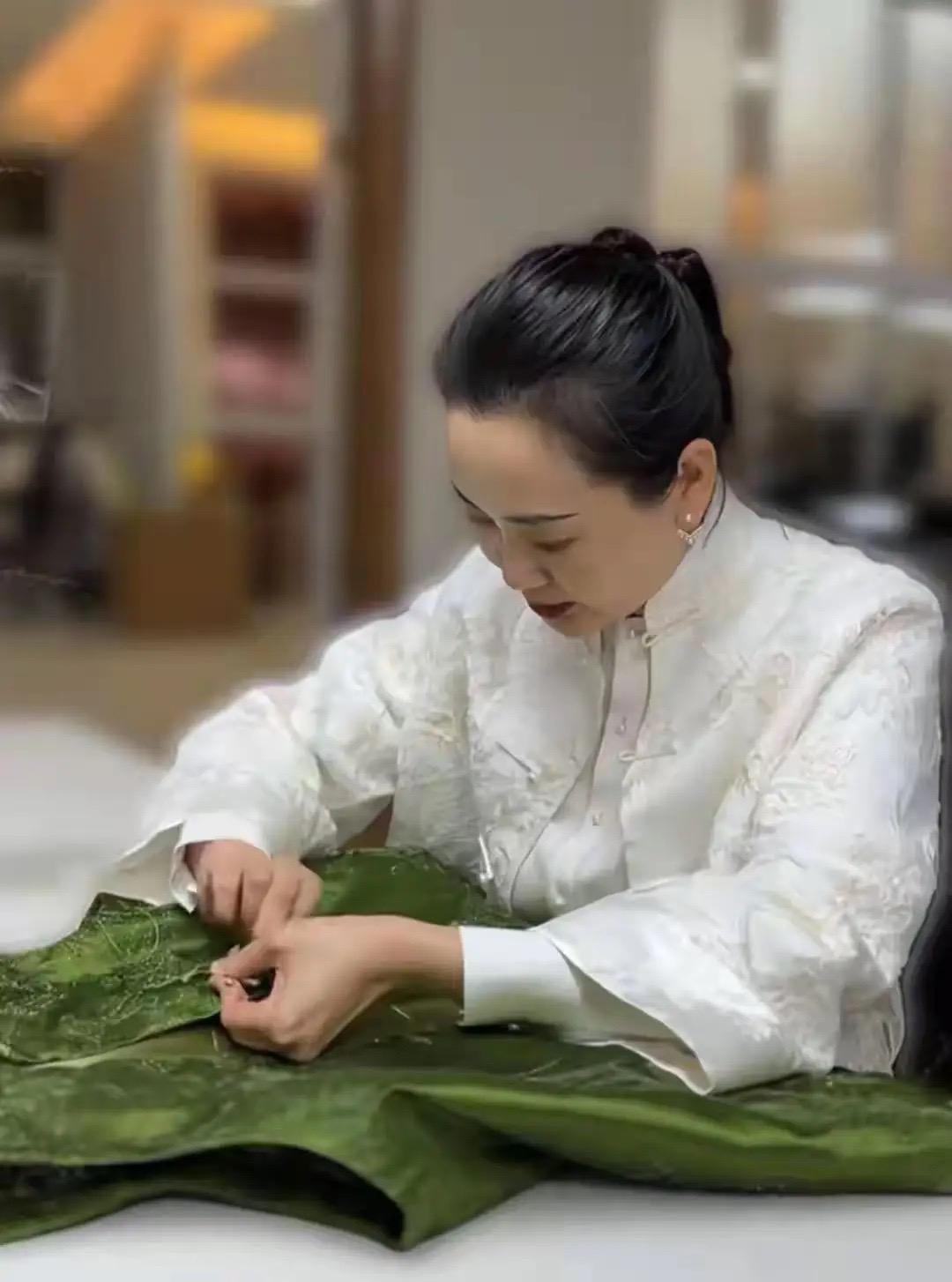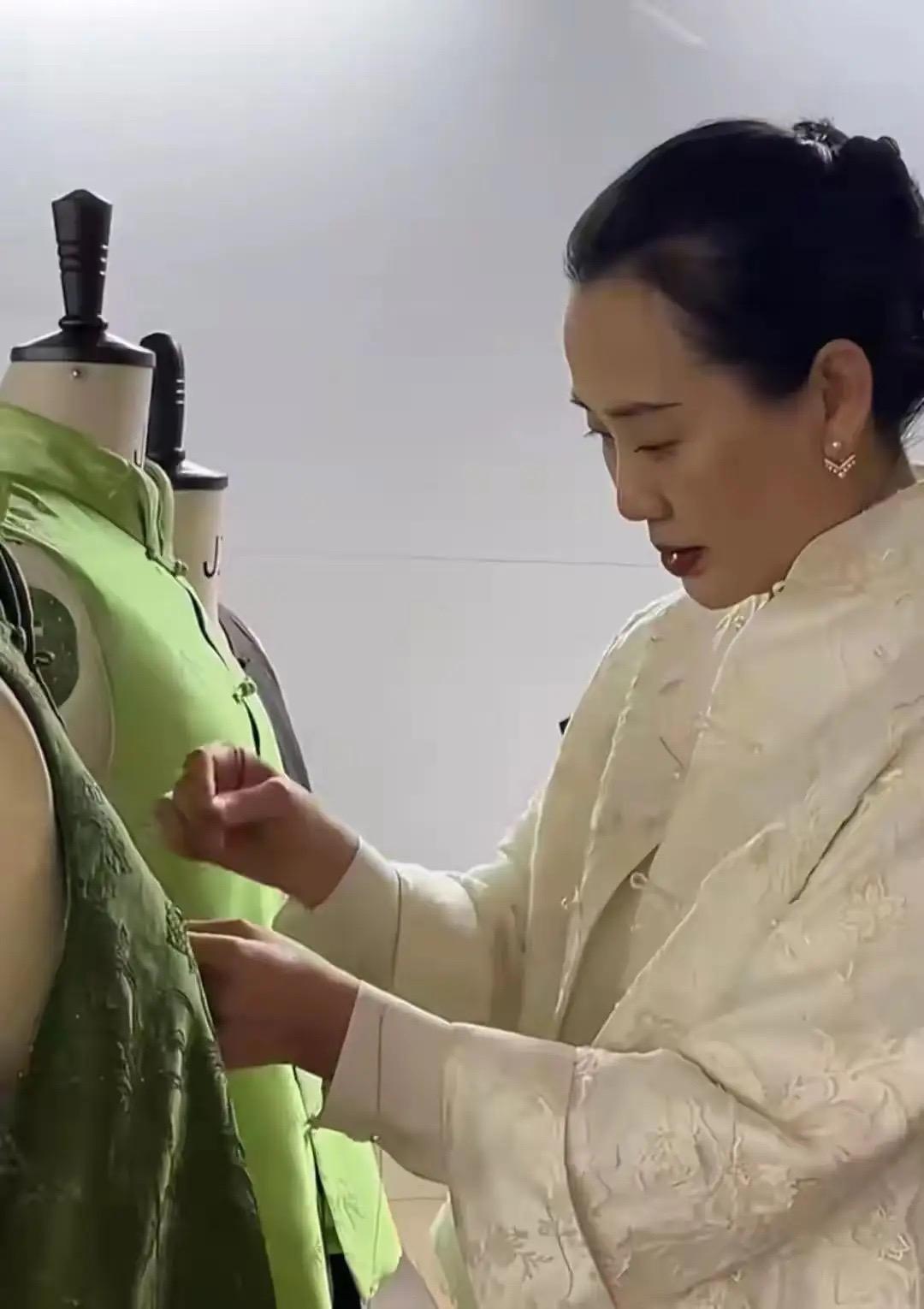 她選擇了很沉穩貴氣的綠色系,馬甲上的刺繡印花特別耐看,西華認真的縫製,一針一線都藏着對婆婆的愛意。