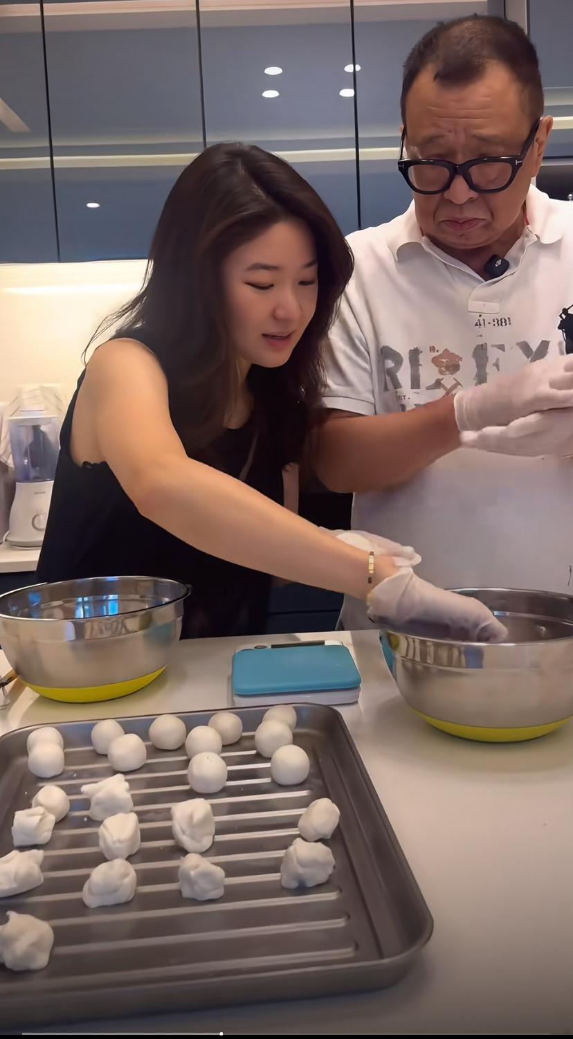 國慶日的時候,許惠菁和爸爸許紹雄一起包湯圓。許紹雄還調侃自己是大廚,在女兒的安排下,認真的抱着湯圓,像是黑芝麻餡的。