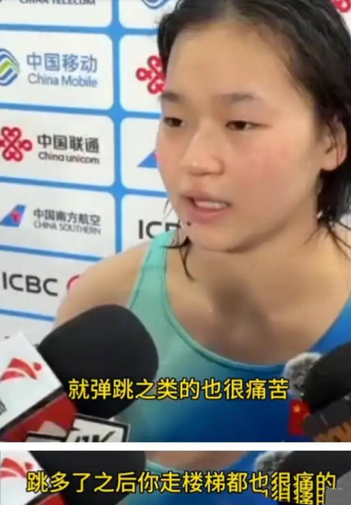 全紅嬋教練也說,她的脛骨、踝關節、都是手傷的,身上大包小包數不清。每天都疼的受不了,冰敷完了繼續跳,跳完了繼續敷。