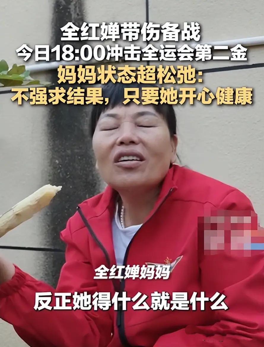在全紅嬋決賽前,媽媽的狀態也很鬆弛。全紅嬋媽媽啃着幹着告訴她:不強求結果,只要她開心健康。
