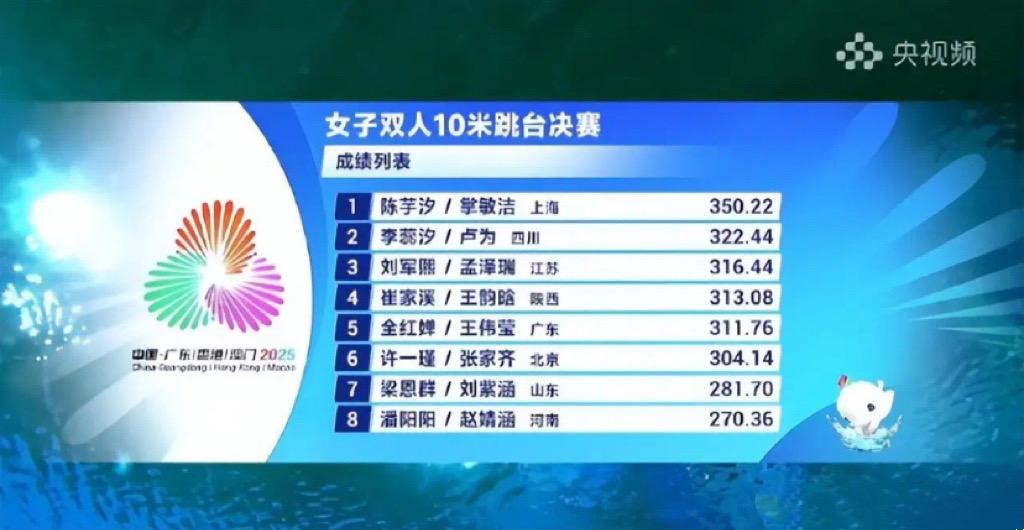 最終成績,全紅嬋和搭檔王偉瑩只排了第五名。有點出乎意料,但也在情理之中。全紅嬋還在恢復期,她表現不夠完美、也是正常。