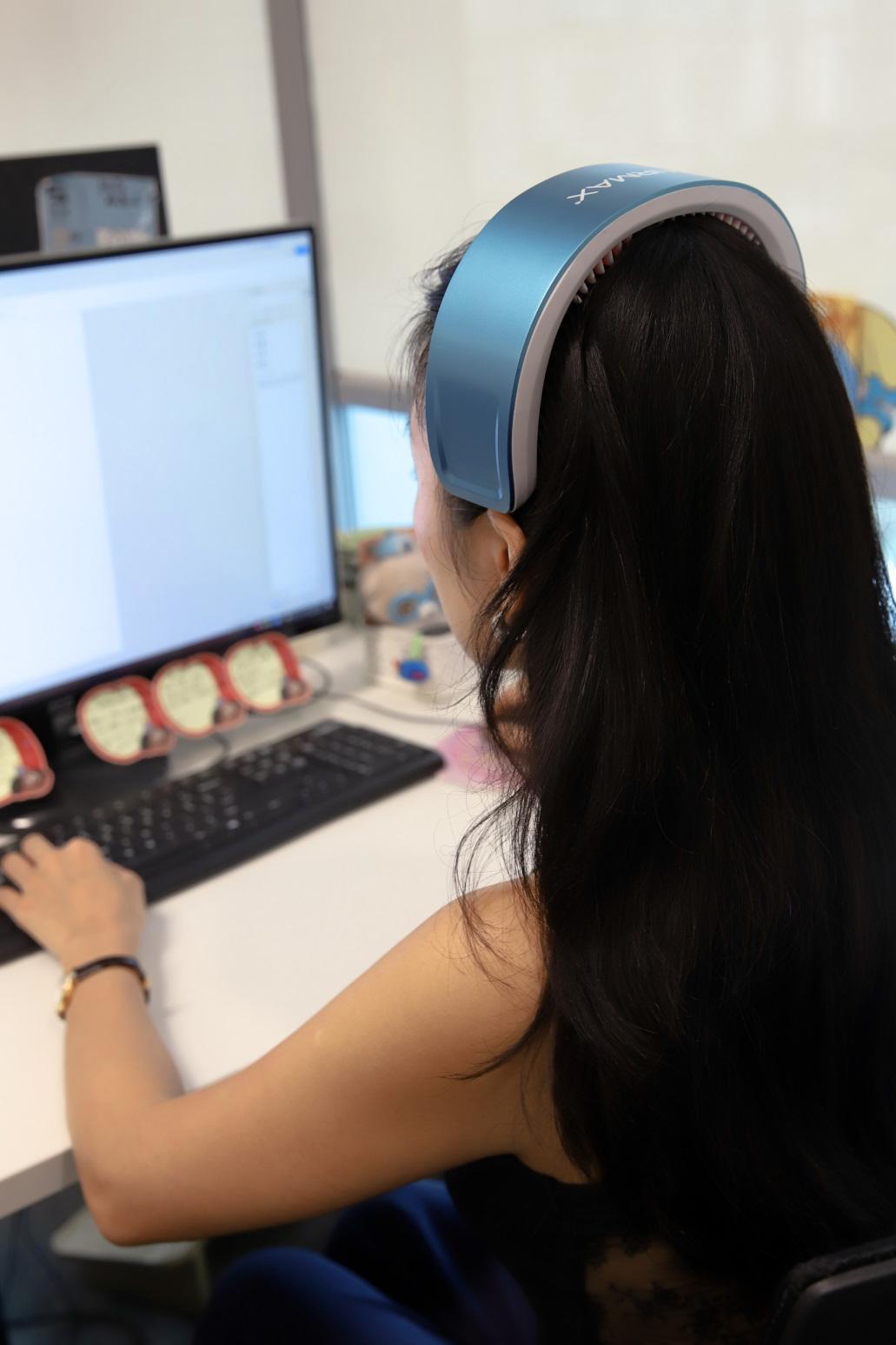 生髮儀戴在頭上 3分鐘很快就過去,也不影響雙手正常工作(右)。