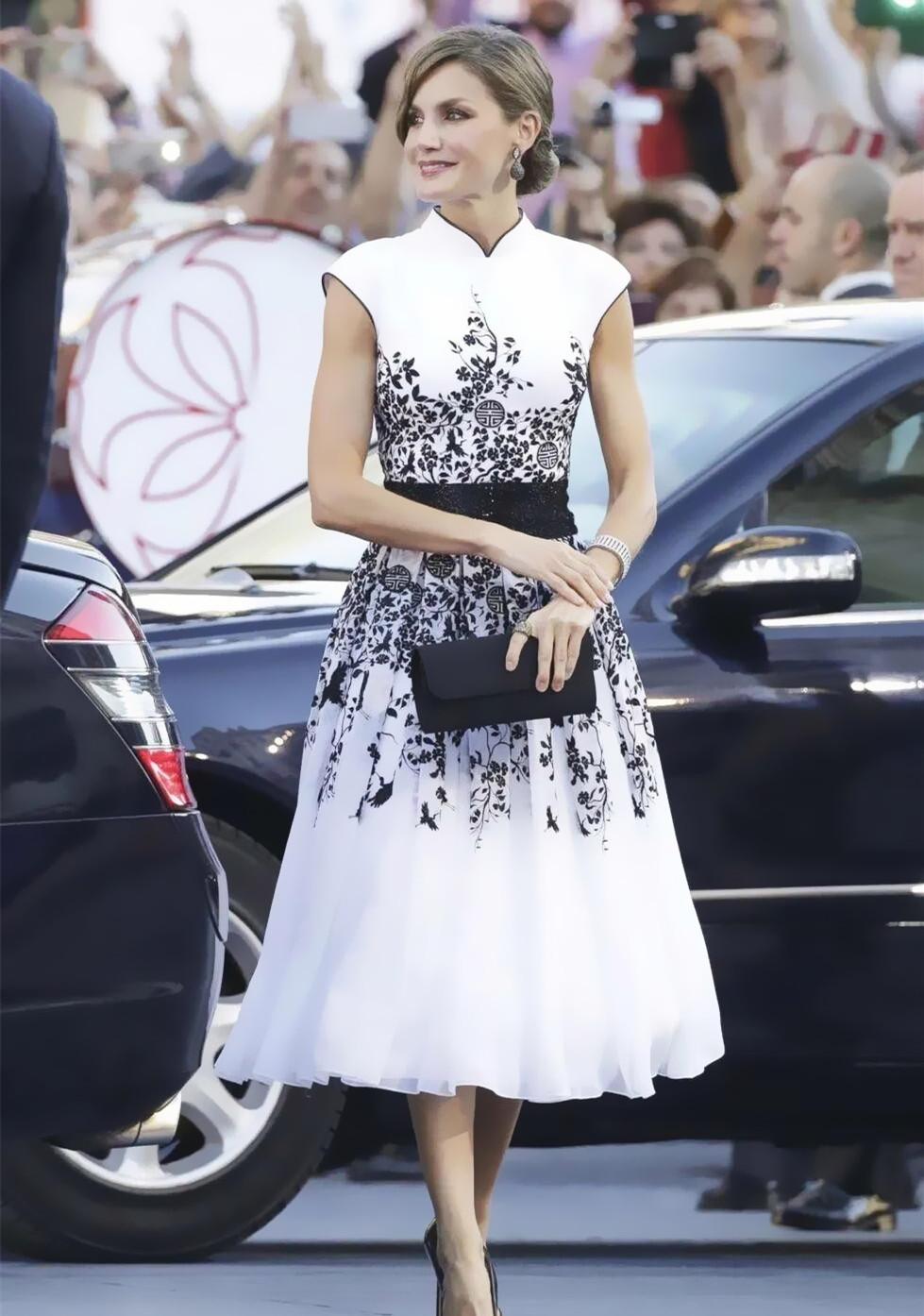 萊蒂齊亞的日常穿搭中,中國風元素頻繁出現,盡顯對東方美學的喜愛。她曾穿中式立領連衣裙,領口刺繡精緻,將東方韻味與西式剪裁巧妙結合,宛如 “錦繡成文原非我有,琳琅滿架惟待人求”。